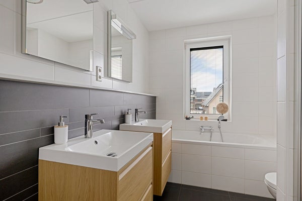 Eerste verdieping: Overloop, drie slaapkamers (8m² met vaste kastruimte, 11m² met vaste kastruimte en 11m²), badkamer voorzien van dubbele wastafel met meubel, luxe ligbad en douchehoek.