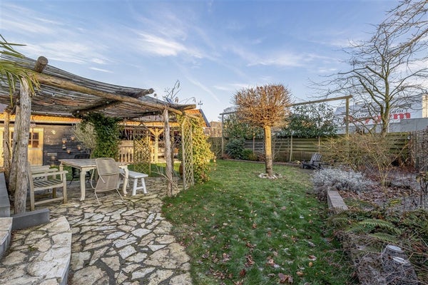 Achtertuin, 300 m² gelegen op het Oosten met meerdere terrassen, gazon, borders en een stoere overkapping.