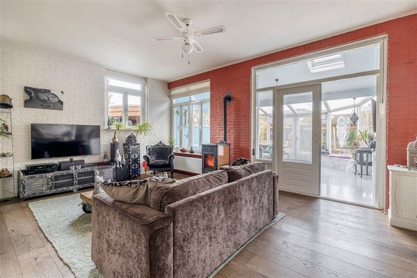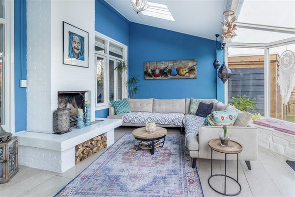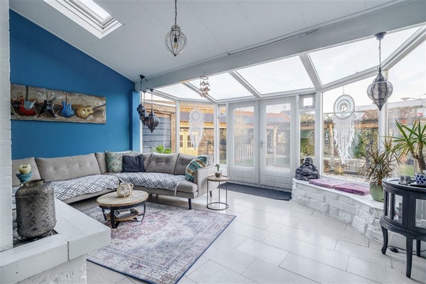 Serre, 22 m², v.v. natuurstenen vloer, open haard, veel raampartijen en openslaande deuren.