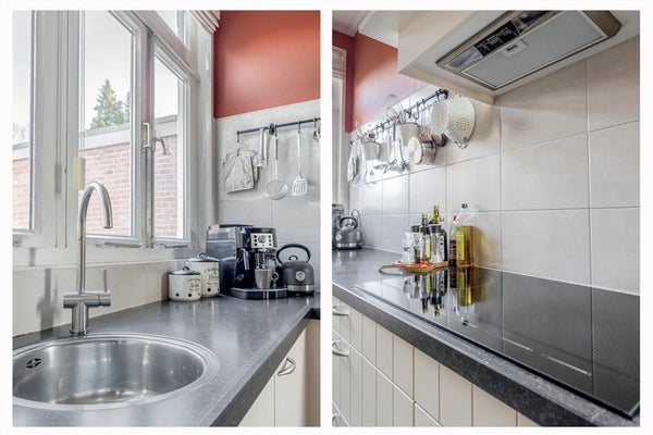 Keuken, 20 m², v.v. natuurstenen vloer, inbouwkeuken in L-vorm v.v. een inductiekookplaat, afzuigkap, combi-oven, koelkast en vaatwasser.