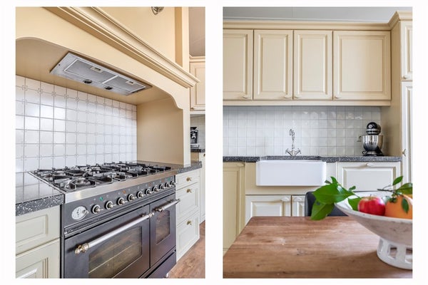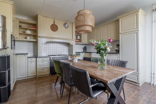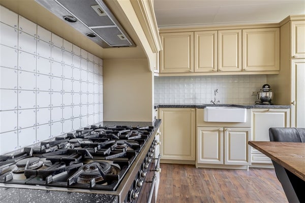 Woonkeuken, 19.6 m², met een inbouwkeuken in U-vorm v.v. 6-pits gaskookplaat, afzuigkap, oven, stenen spoelbak, vaatwasser, magnetron en koeler.