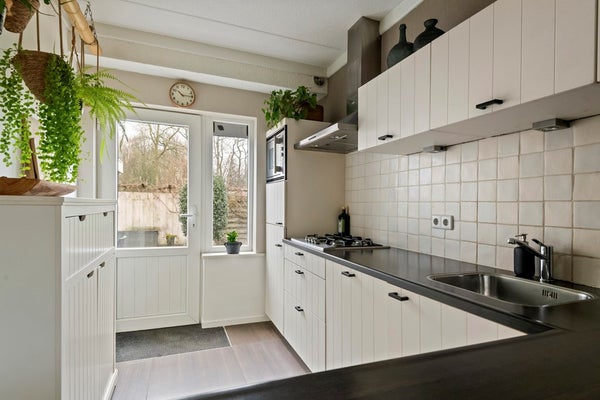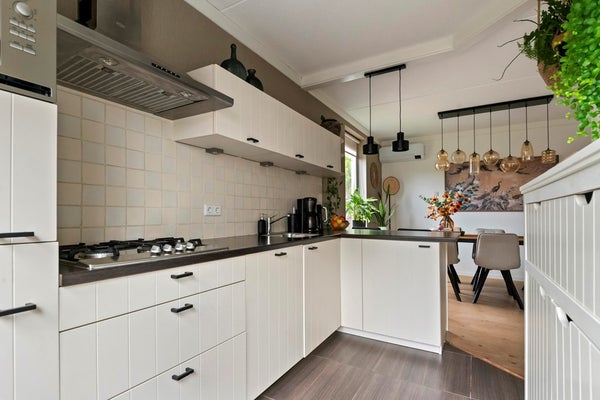 De woonkamer staat in open verbinding met de halfopen keuken. Deze is uitgevoerd in een royale, lichte opstelling en voorzien van diverse inbouwapparatuur, waaronder een gaskookplaat, afzuigkap, combimagnetron, koel-vriescombinatie en vaatwasser. Een leuke extra is de bar in de keuken: perfect als plek voor het ontbijt, een snelle lunch of een borrelmoment terwijl er gekookt wordt.