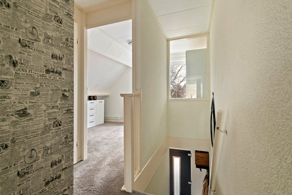 De gehele eerste verdieping is afgewerkt met vloerbedekking. Op de overloop bevindt zich tot slot een vaste kast met de cv-opstelling (Nefit Ecomline 22HRC 2000) en extra opbergruimte.