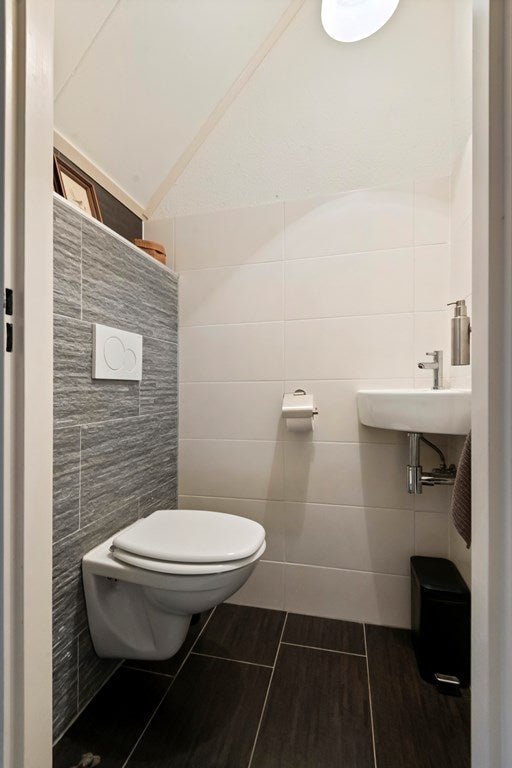 Vervolgens lopen we door naar de badkamer. Een heerlijk verblijf met de luxe van een ligbad. Fijn detail is hier het Velux dakraam, dat zorgt voor een goede ventilatie en fijne lichtinval. De badkamer is tevens voorzien van een toilet, douchegelegenheid en wastafel in een meubel.