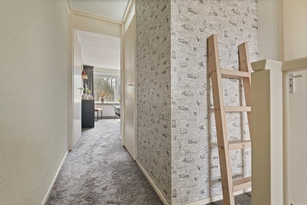 In de hal is bovendien een praktische vaste schuifwand geplaatst. Achter deze schuifwand vind je extra bergruimte en de aansluiting voor de wasmachine.