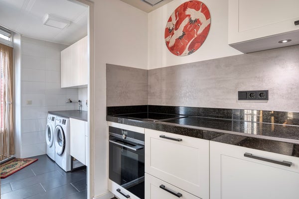 Begane grond: Via de voordeur komen we als eerste in de hal. Deze hal heeft deuren naar het toilet met een fonteintje en de meterkast. Vanuit de hal is er toegang tot de ruime, uitgebouwde woonkamer. Dankzij ramen aan drie zijden profiteert deze ruimte van bovengemiddeld veel lichtinval en een prettig vrij uitzicht aan de voorzijde. De woonkamer biedt volop ruimte voor een royale zithoek, een eethoek én eventueel een speelhoek of werkplek. De halfopen keuken (2022) is neutraal uitgevoerd en in een praktische hoekopstelling geplaatst. De keuken beschikt over hoog kwalitatieve inbouwapparatuur, waaronder een inductiekookplaat, afzuigkap, koelkast, vaatwasser en bakoven met magnetron. Direct naast de keuken bevindt zich de bijkeuken met vaste kastenwand, wasmachineaansluiting en ruimte voor een droger – een zeer praktische toevoeging in het dagelijks gebruik. Vrijwel de gehele begane grond is afgewerkt met een PVC vloer en voorzien van vloerverwarming.