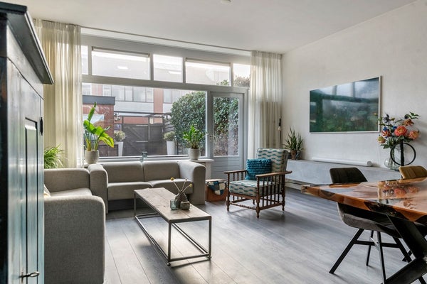 De begane grond is uitgevoerd als splitlevel, wat de woning een speels en ruimtelijk karakter geeft. Via een korte trap bereik je de woonkamer, die dankzij de grote raampartijen heerlijk licht en ruim aanvoelt. Er is voldoende ruimte voor zowel een gezellige eethoek als een comfortabele zithoek. Vanuit de woonkamer is bovendien de tuin direct bereikbaar.
