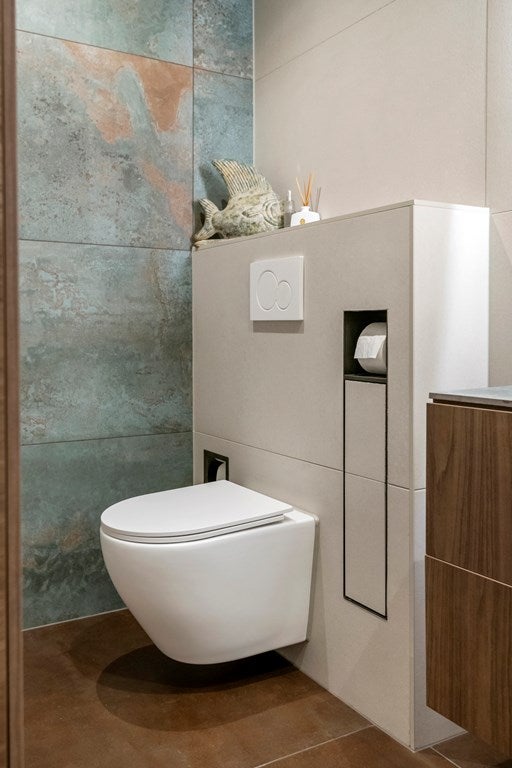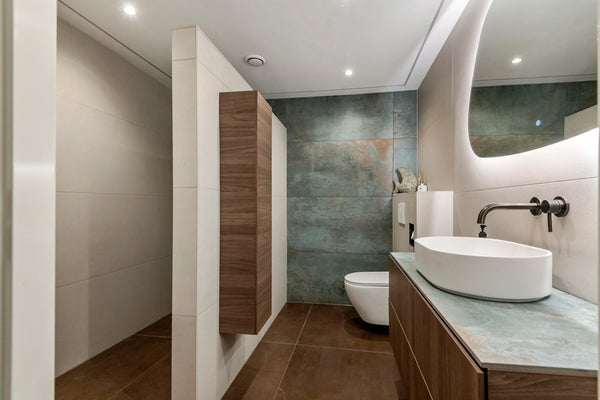 Ook vind je hier de moderne badkamer, die in 2025 volledig is vernieuwd en uitgevoerd is in stijlvolle aardetinten. De badkamer is voorzien van een luxe wastafelmeubel, een zwevend toilet en een diepe inloopdouche met een ingebouwde nis voor doucheartikelen. Daarnaast beschikt de badkamer over een spiegel met verlichting en verwarming, wat zorgt voor een luxe uitstraling en prettig licht. Voor extra comfort is er elektrische vloerverwarming aanwezig, gecombineerd met een designradiator.