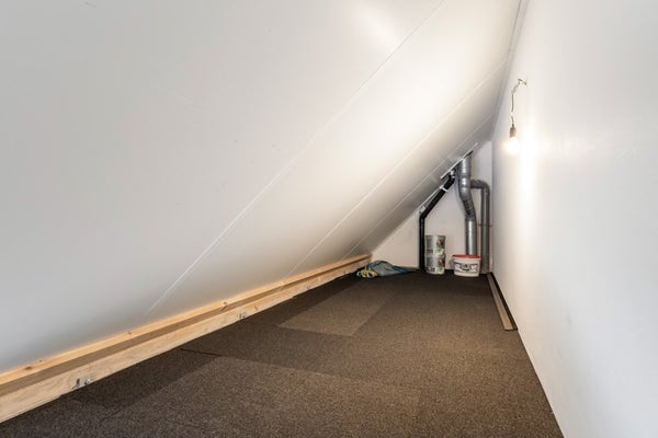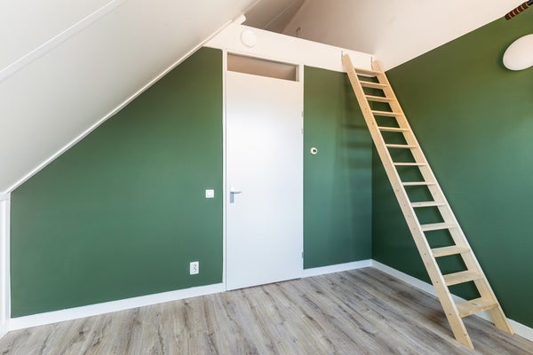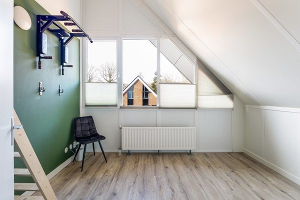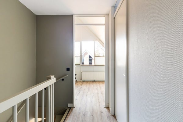 Via een vaste trap kom je op de overloop van de 1e verdieping. Vanaf hier bereik je 2 slaapkamers en de badkamer. De badkamer is geheel betegeld en ingericht met een douchecabine met regendouche, een wandcloset en een wastafelmeubel. Daarnaast is er een praktische nis met aansluitingen voor de wasmachine en droger. Beide slaapkamers zijn keurig afgewerkt, waaronder de ouderslaapkamer met vaste kastenwand. De slaapkamer aan de voorzijde beschikt over een open nok met een hoogte van maar liefst 4,8 meter. Vanuit deze kamer is via een losse trap de praktische bergvliering bereikbaar. De vliering zorgt voor veel extra bergruimte.