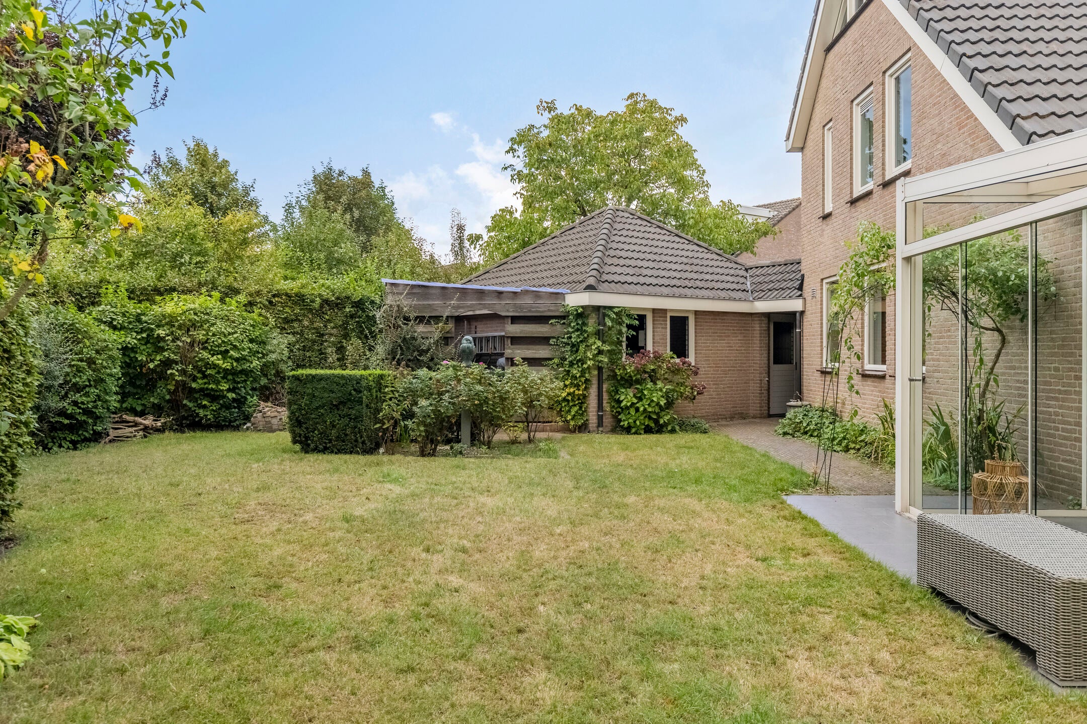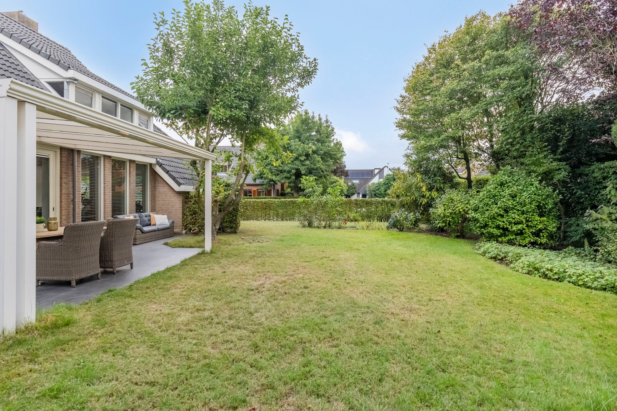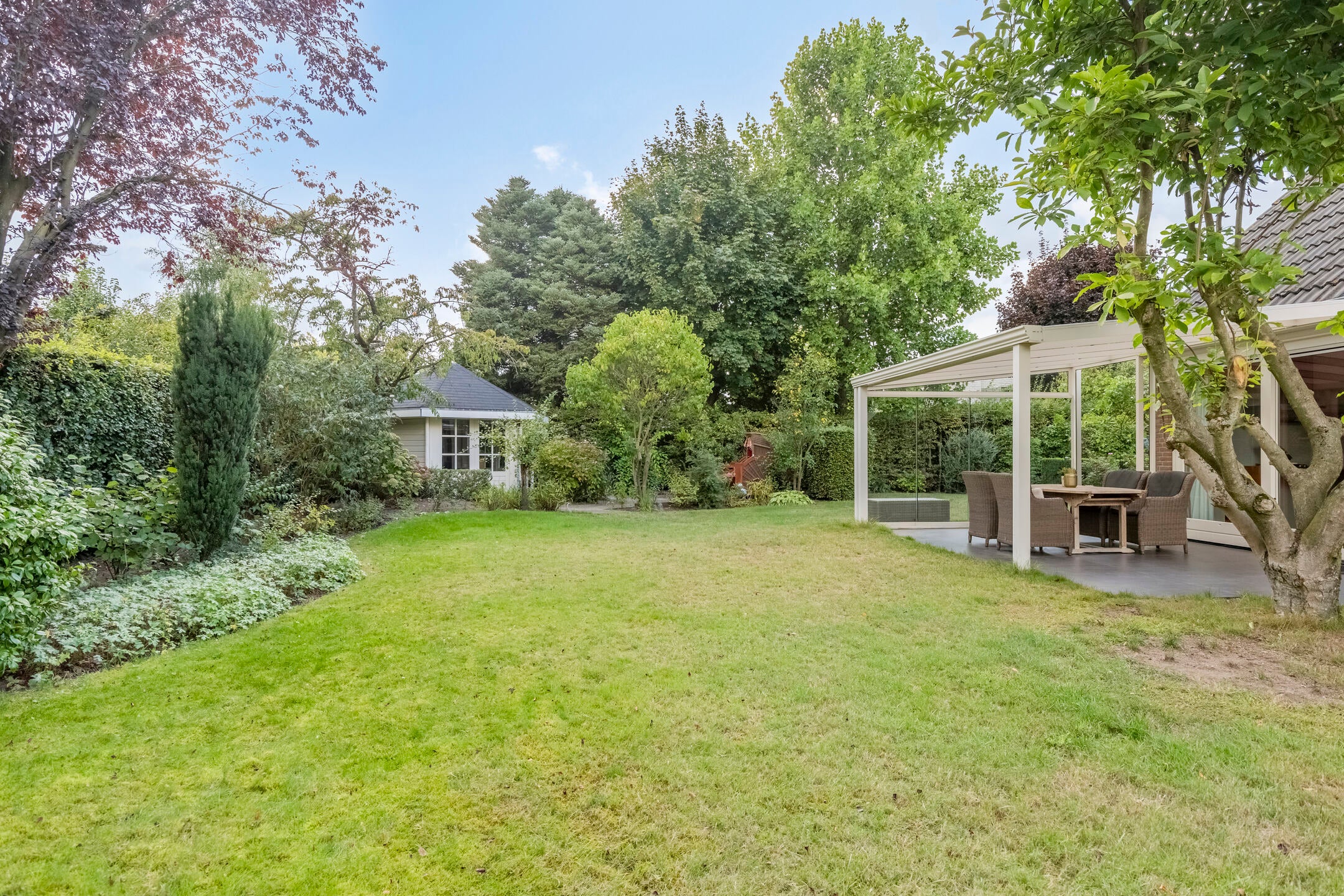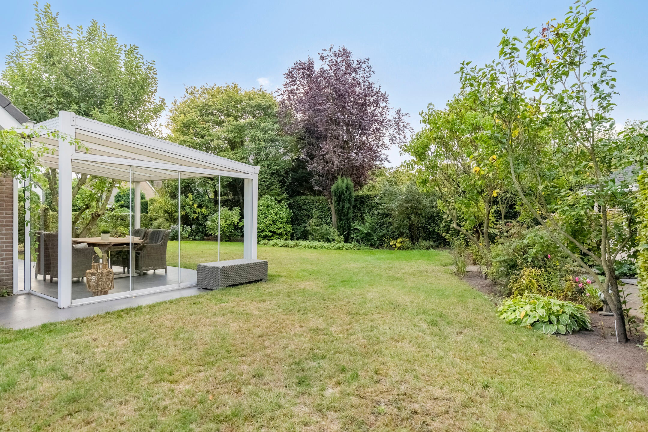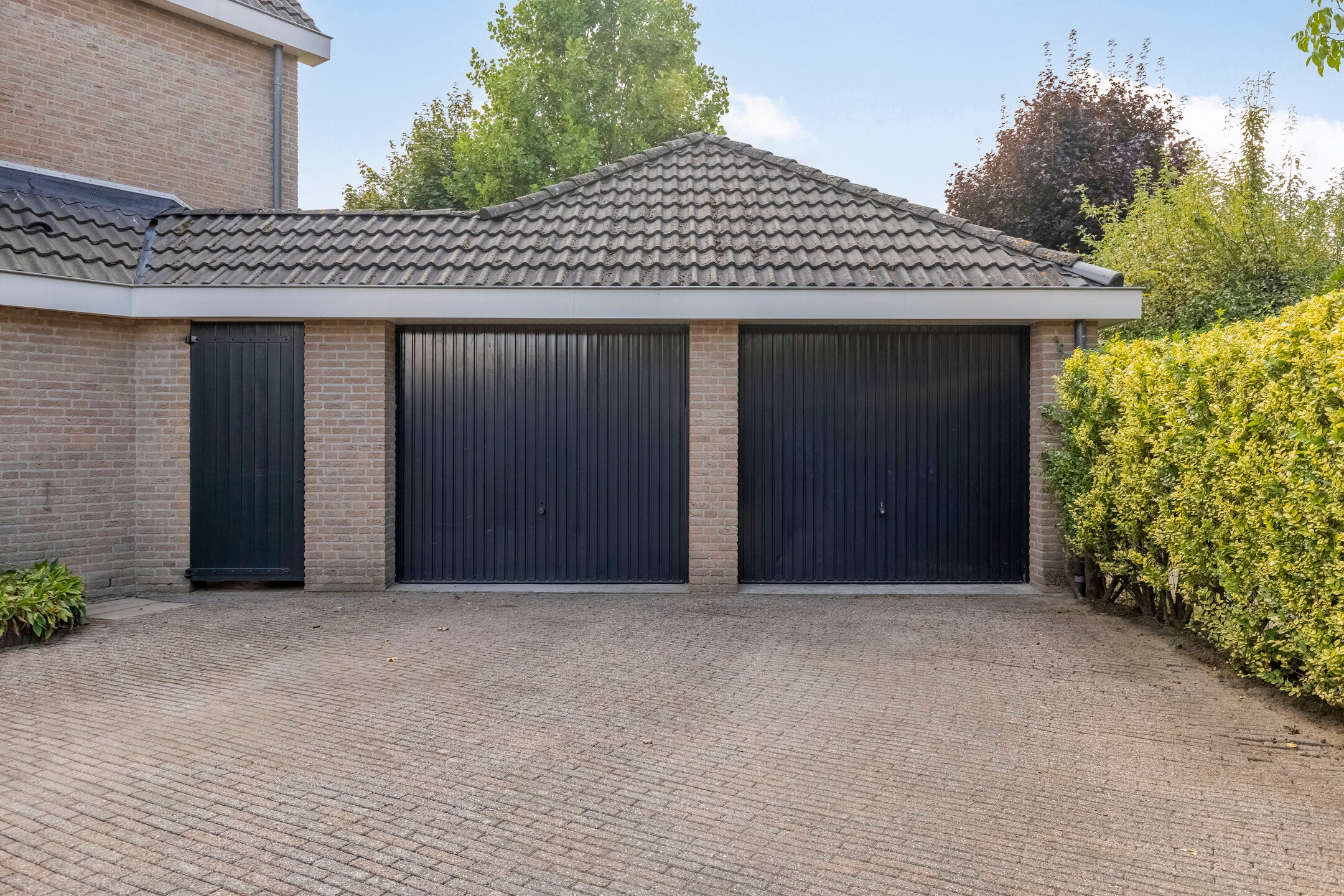 De tuin biedt privacy en heeft meerdere terrassen en een tuinhuisje. De garage is geschikt voor twee auto's, en er is voldoende parkeerruimte op eigen terrein. Een ideale woning voor een gezin.