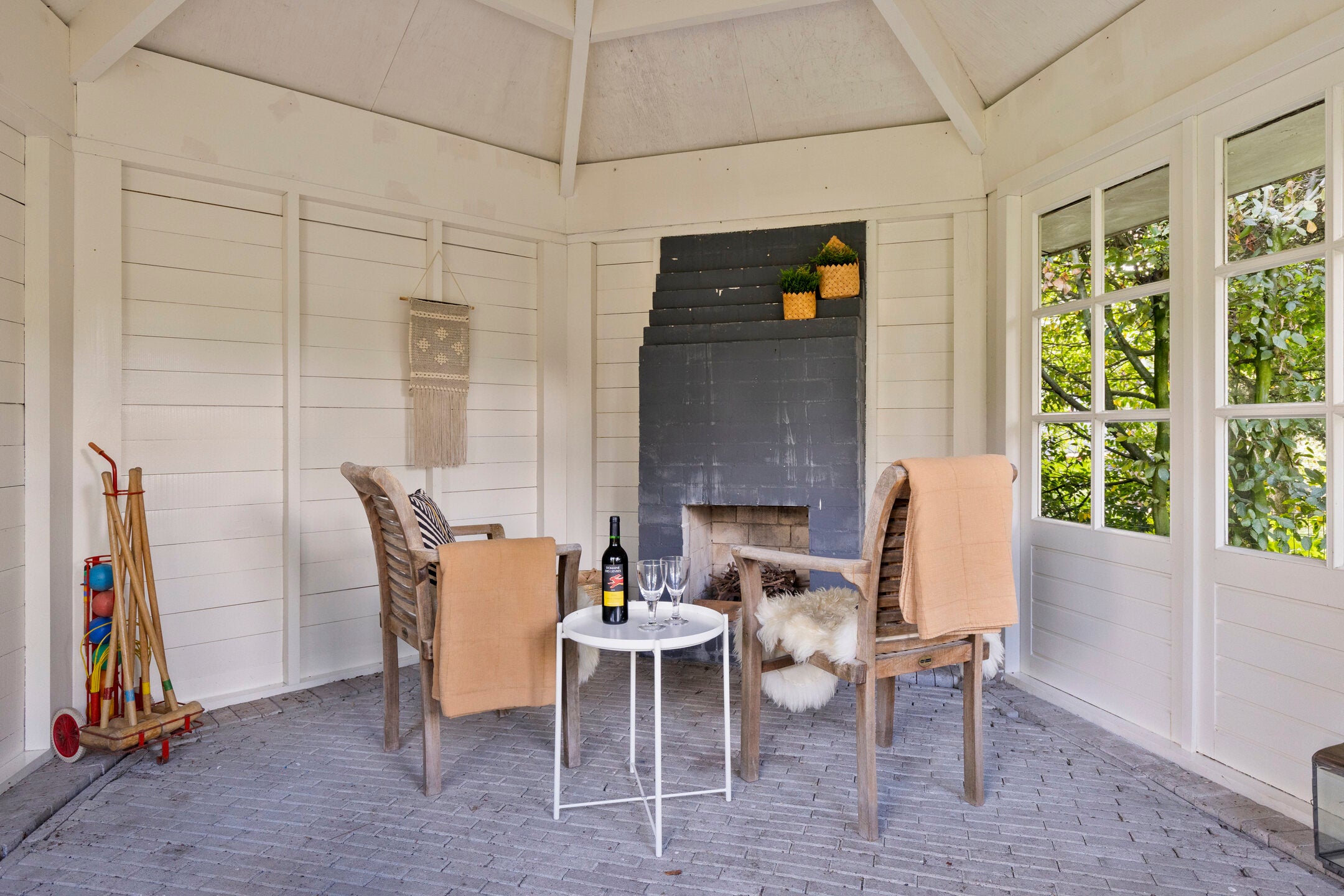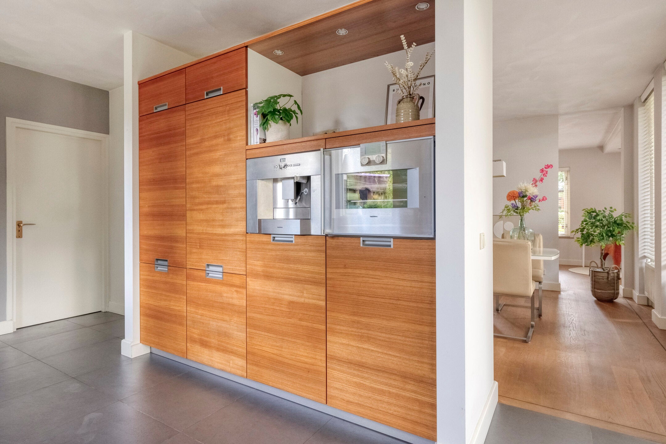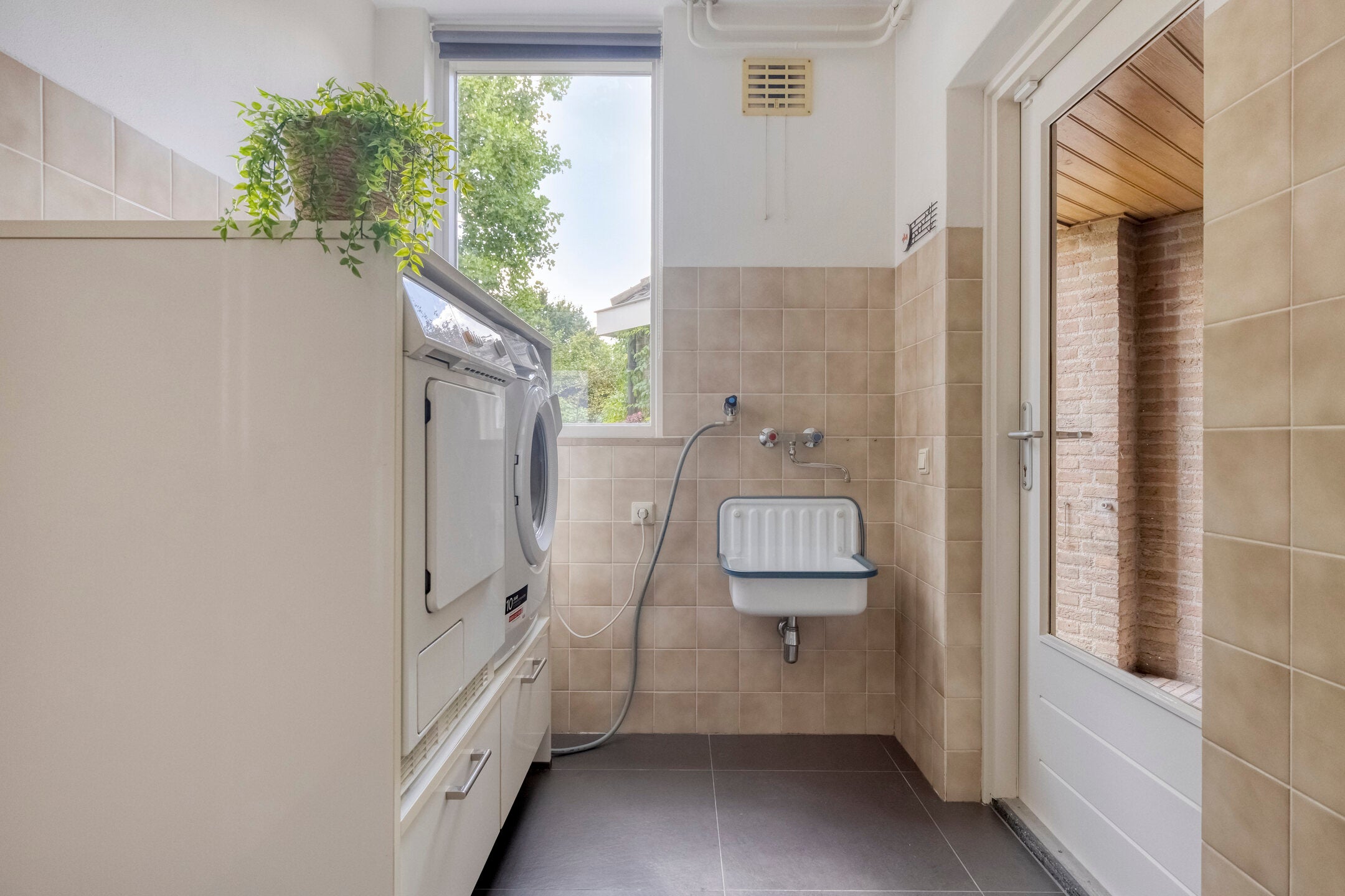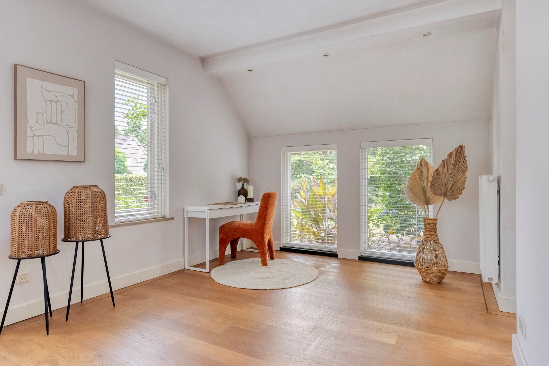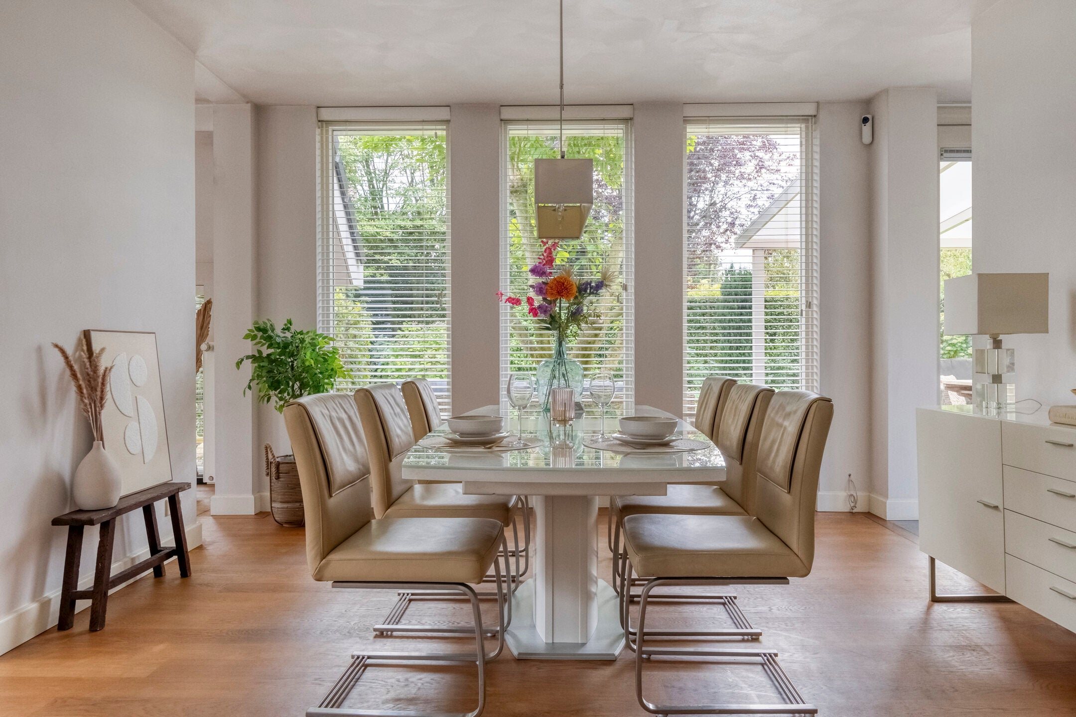 De tuin biedt privacy en heeft meerdere terrassen en een tuinhuisje. De garage is geschikt voor twee auto's, en er is voldoende parkeerruimte op eigen terrein. Een ideale woning voor een gezin.