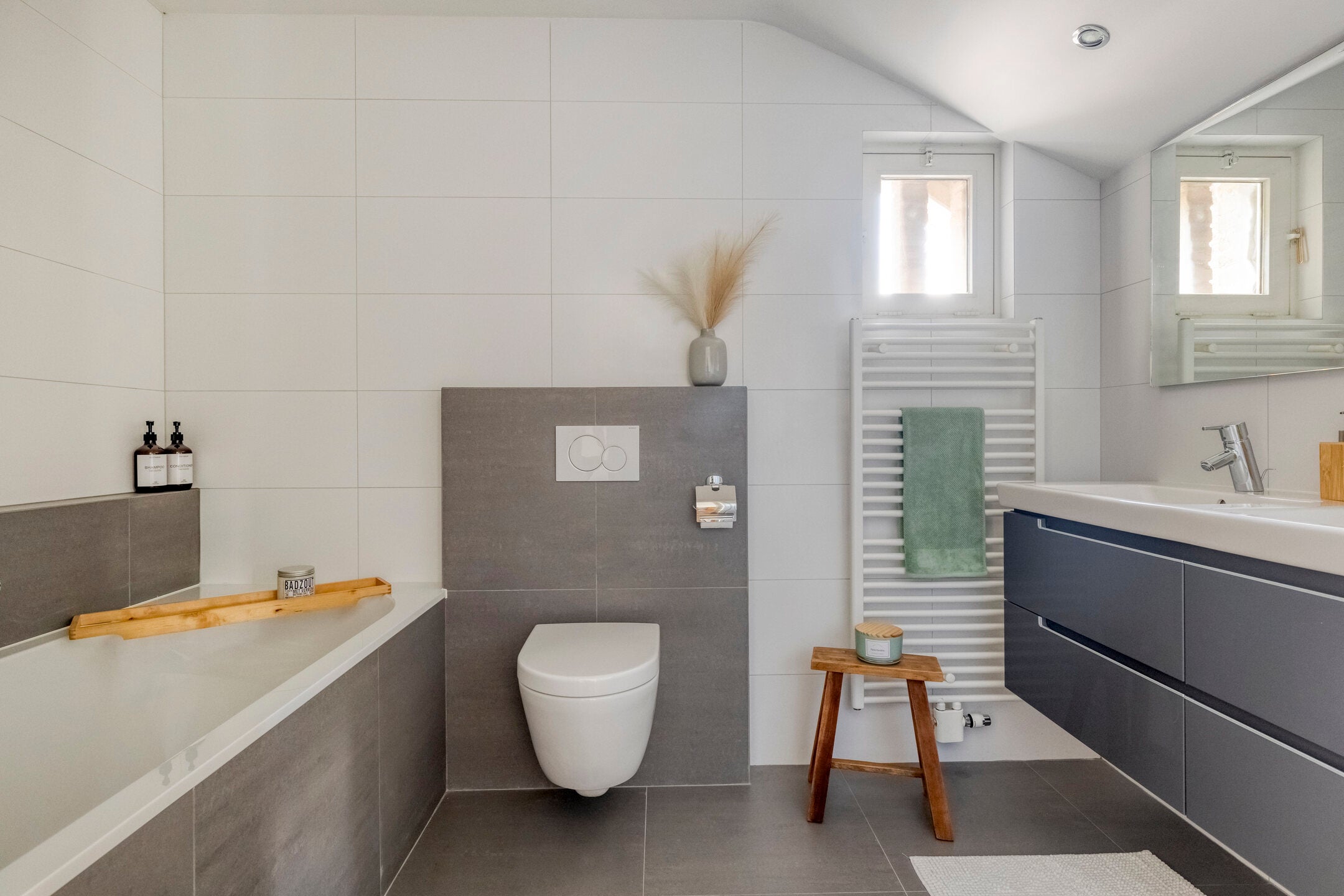 De indeling omvat een lichte hal, een gezellige woonkamer met houten vloer, gashaard en een aangrenzende, volledig uitgeruste keuken. Op de eerste verdieping zijn vier ruime slaapkamers en twee badkamers. De tweede verdieping heeft een vijfde slaapkamer met eigen wastafel.