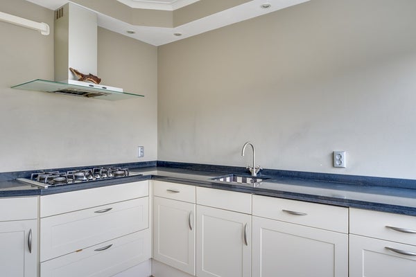De tuinkamer is uitgerust met een praktische kitchenette met wasbak, koelkast en aansluiting voor de wasmachine. Deze ruimte staat in directe verbinding met de ruime, diepe achtertuin, waardoor binnen en buiten naadloos in elkaar overgaan en een fijne plek ontstaat om te ontspannen.