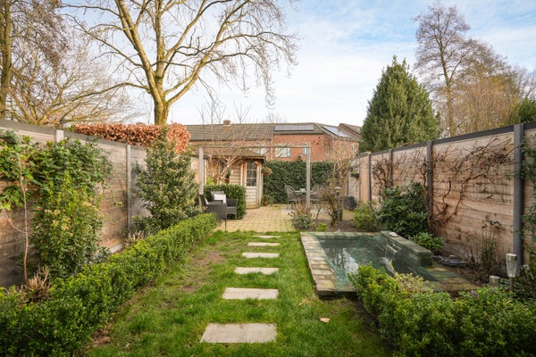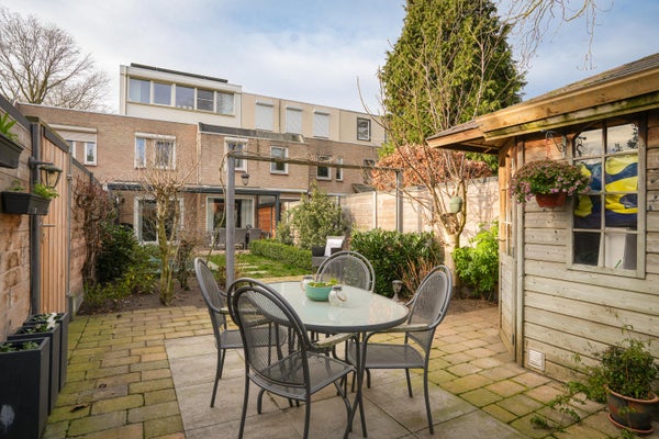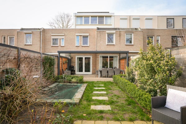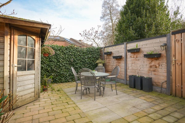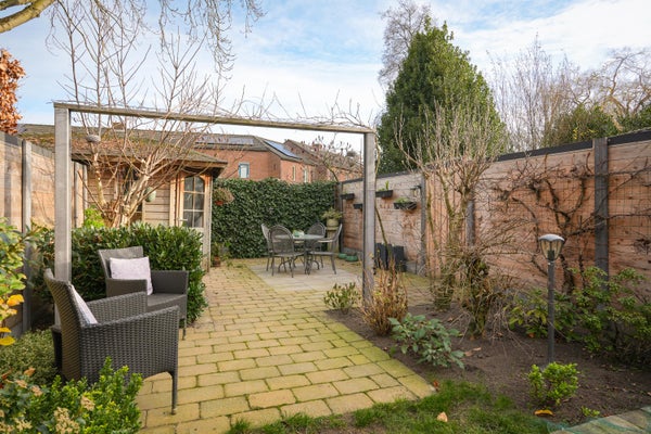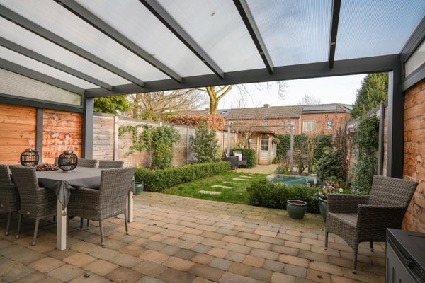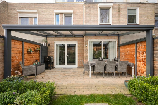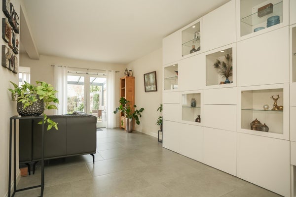 De woonkamer ligt aan de achterzijde van de woning. De woonkamer is, net als de keuken, voorzien van een fraaie vloer met groot formaat tegels met vloerverwarming. Heerlijk comfortabel dus. De grote raampartijen in de woonkamer zorgen voor een prachtig zicht op de diepe achtertuin. Deze tuin is echt bijzonder; door de diepte geniet je hier van veel privacy en is er de hele dag wel een plekje in de zon te vinden. Direct aan de woning grenst een royale overkapping met sfeervolle inbouwverlichting, waardoor je ook op de wat koelere avonden heerlijk buiten kunt zitten. Of je nu droomt van een weelderige groene tuin, een veilige speelplek voor de kinderen of een luxe buitenkeuken: de mogelijkheden zijn eindeloos. De diepte van het perceel geeft een gevoel van vrijheid en rust, waardoor de tuin echt een verlengstuk van je woonplezier wordt.