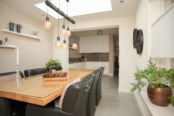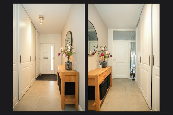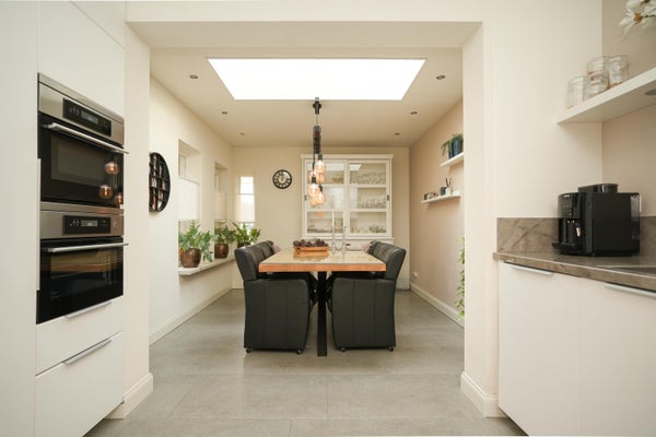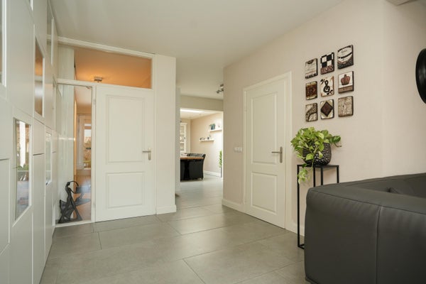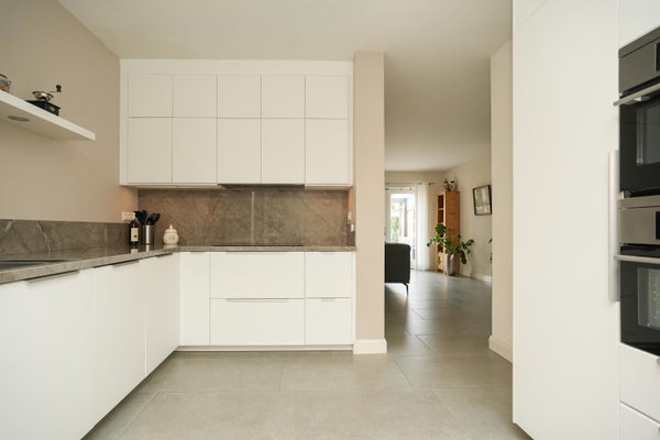 Het absolute hart van deze woning is de royale leefkeuken aan de voorzijde. Door een doordachte uitbouw is hier een ruimte ontstaan die veel meer is dan alleen een plek om te koken. Het is de plek waar je de dag rustig begint met een kop koffie, waar de kinderen na schooltijd hun verhalen delen aan de grote eettafel en waar je tijdens het koken in contact blijft met je gasten. De keuken is voorzien van alle moderne gemakken en inbouwapparatuur. Deze woonkeuken nodigt uit tot lange avonden tafelen en het creëren van mooie herinneringen.