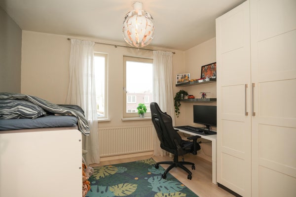 Ook op de verdiepingen komen de royale maten terug. De hoofdslaapkamer is met recht royaal te noemen en biedt meer dan genoeg ruimte voor een grote kastenwand en een gezellig zitje. Indien gewenst is deze kamer zelfs eenvoudig onder te verdelen in twee slaapkamers, of een slaapkamer met een aangrenzende walk-in closet. De tweede slaapkamer op deze verdieping is met haar afmetingen eveneens flink te noemen. Verder tref je op deze etage de badkamer aan, met aansluitend een praktische was- en bergruimte. De badkamer is voorzien van een bad-douchecombinatie, wastafelmeubel en toilet. In de wasruimte vind je de aansluitingen voor je wasmachine en droger, de opstelplaats voor de cv-ketel en ontzettend veel extra opbergruimte.