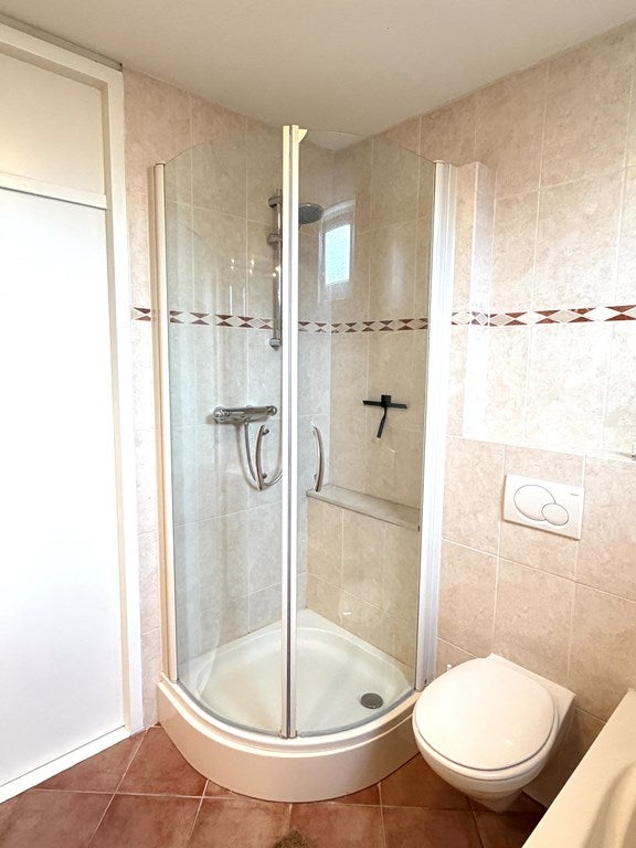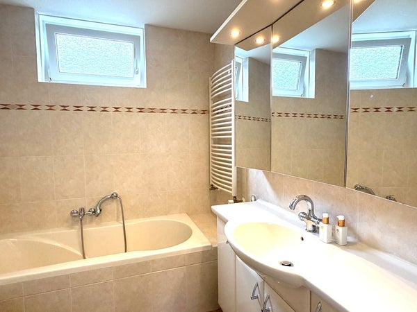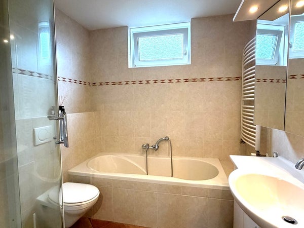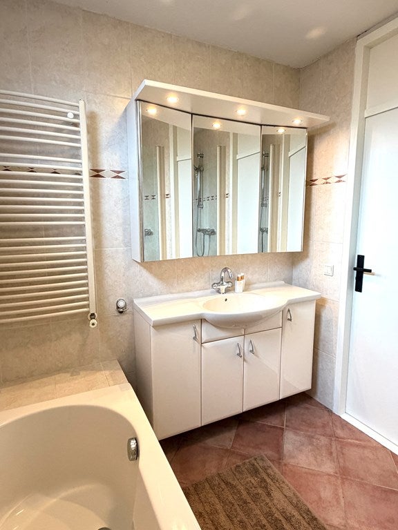 • De geheel betegelde badkamer is ingericht met een ligbad, separate douche, wastafel met meubel en een designradiator.