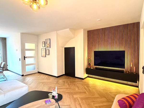 • Ruime en zeer sfeervolle woonkamer voorzien van PVC vloer met vloerverwarming; de wanden zijn voorzien van glad stucwerk.