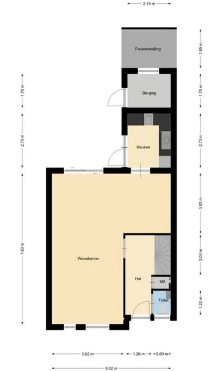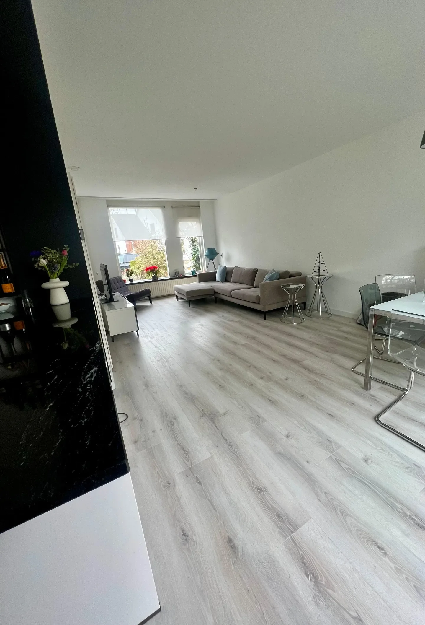 Bij binnenkomst in de hal tref je een laminaatvloer, toilet en een trap naar de eerste verdieping. De L-vormige woonkamer biedt veel daglicht door de dubbele beglazing. De moderne keuken is uitgerust met een inductiekookplaat, oven, vaatwasser en een mooi werkblad.