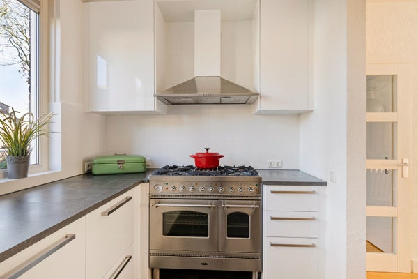 De vernieuwde keuken (2024), gelegen aan de voorzijde van de woning, is uitgevoerd in een praktische U-opstelling en beschikt over een Boretti gasfornuis met dubbele oven, een RVS afzuigkap en ruime hoeveelheid kastruimte.