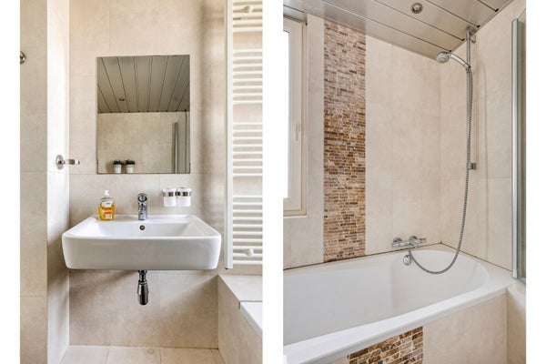 De geheel betegelde badkamer is ingericht met een ligbad/douche met thermostaatkraan, een vaste wastafel en een hangend closet. Daarnaast beschikt de badkamer over inbouwspotjes en mechanische ventilatie.