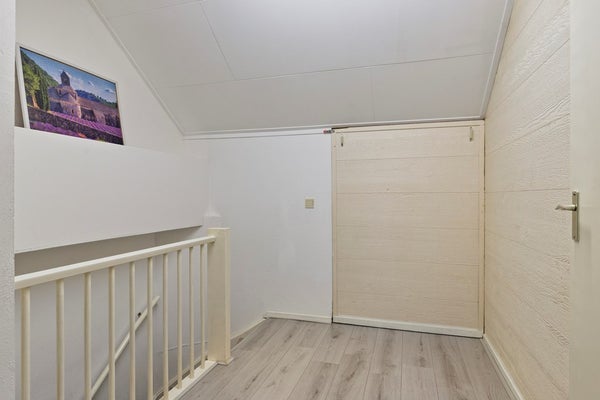 Vanuit de overloop zijn 3 ruime slaapkamers, de badkamer en de trapopgang naar de tweede verdieping bereikbaar. De badkamer is geheel betegeld en is v.v. een wastafel met meubel en een kastje, een douchecabine, een hangend toilet, een hoekbad en een designradiator. De vloer van de slaapkamers en overloop is v.v. laminaat. De wanden zijn v.v. stucwerk en behang. De plafonds zijn afgewerkt met stucwerk. De kozijnen zijn van kunststof en v.v. HR++ glas en een hor.
