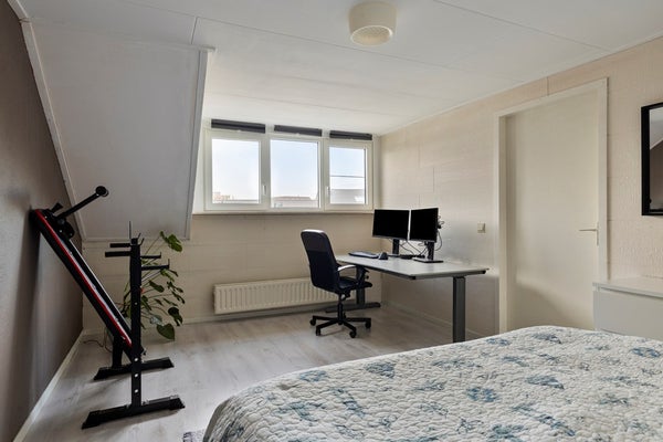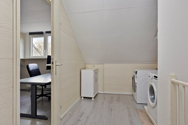 Middels een vaste trap is de voorzolder bereikbaar. Hier zijn de aansluiting voor de wasmachine en de cv-ketel gesitueerd. Vanuit de voorzolder is de vierde slaapkamer bereikbaar. De vloer van de tweede verdieping is v.v. laminaat. De wanden zijn afgewerkt met structuurverf en wandpanelen. De kozijnen zijn van kunststof en v.v. HR++ glas en een hor.