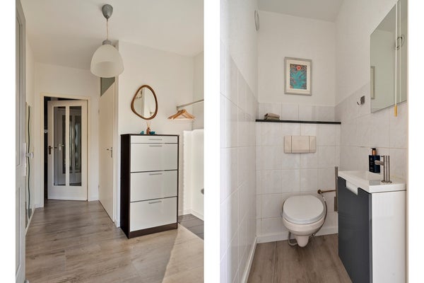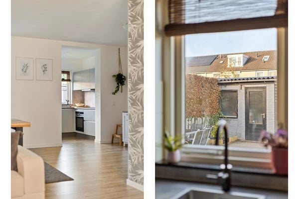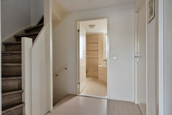 Door deze raampartij is er veel lichtinval in de woonkamer. Vanuit de woonkamer is er toegang tot een halletje met een trapopgang naar de eerste verdieping. Een trapkast zorgt voor extra bergruimte. Het toilet is deels betegeld en v.v. een hangend toilet en een fonteintje. De vloer van de begane grond is v.v. laminaat. De wanden zijn afgewerkt met stucwerk en behang. De plafonds zijn afgewerkt met stucwerk. De kozijnen zijn van hout en van kunststof en v.v. HR++ glas.