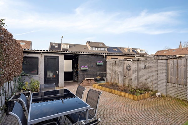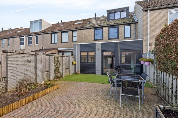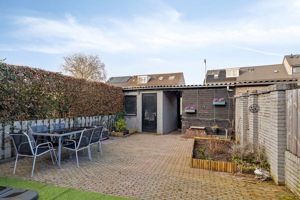 De achtertuin, gelegen op het noordwesten, is aangelegd met sierbestrating, kunstgras en borders en bloembakken met vaste beplanting. Achter in de tuin bevinden zich een berging met een overkapping. De achtertuin is bereikbaar middels een achterom met poort.