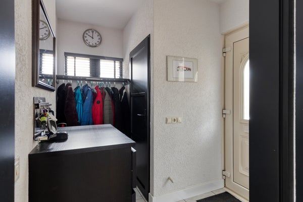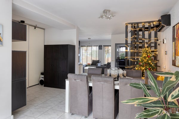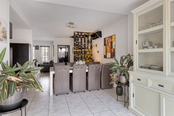 Bij binnenkomst in de hal vindt je vloerverwarming en een betegelde toiletruimte. De royale woonkamer met airco heeft een schuifpui naar het overdekte terras. De open keuken is modern ingericht en toegang tot de tuin. Op de eerste verdieping zijn drie slaapkamers en een geheel betegelde badkamer met douche en toilet. De tweede verdieping herbergt een ruime zolderkamer.
