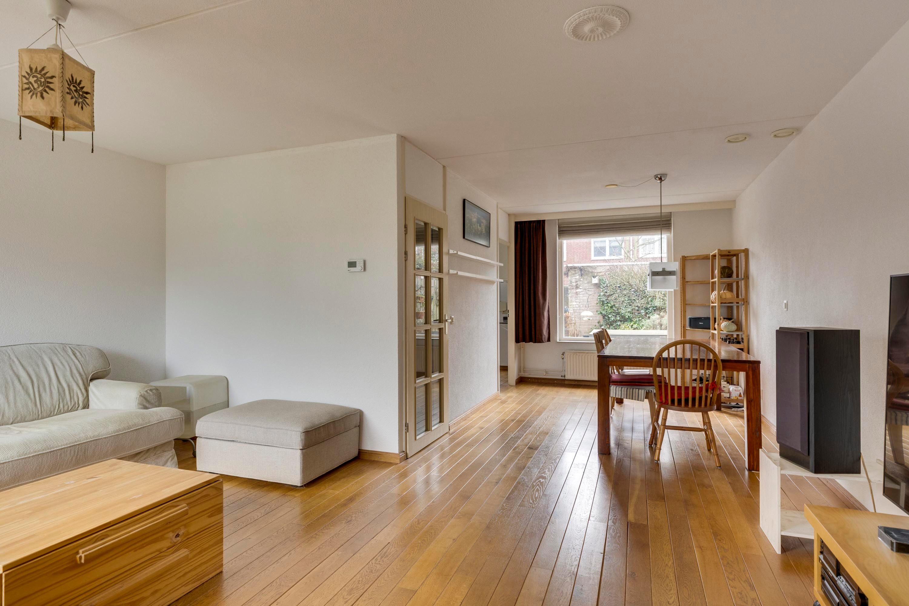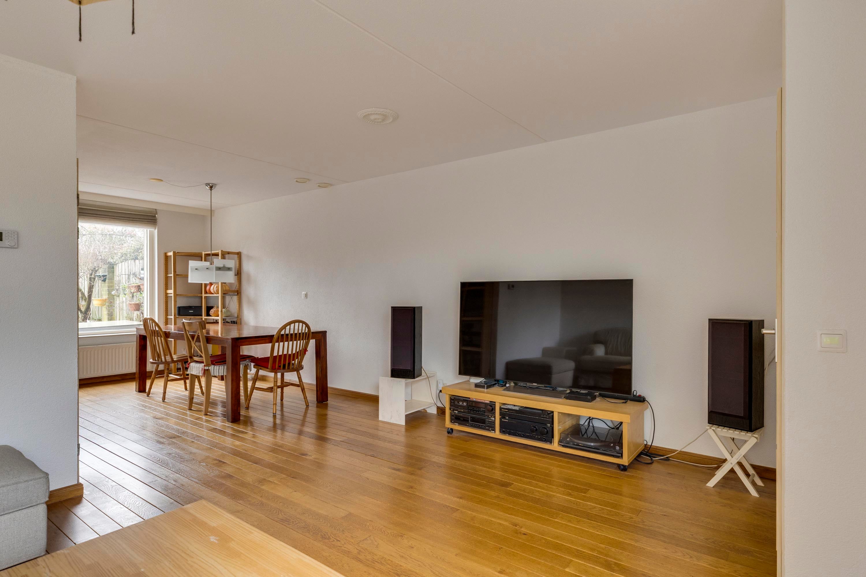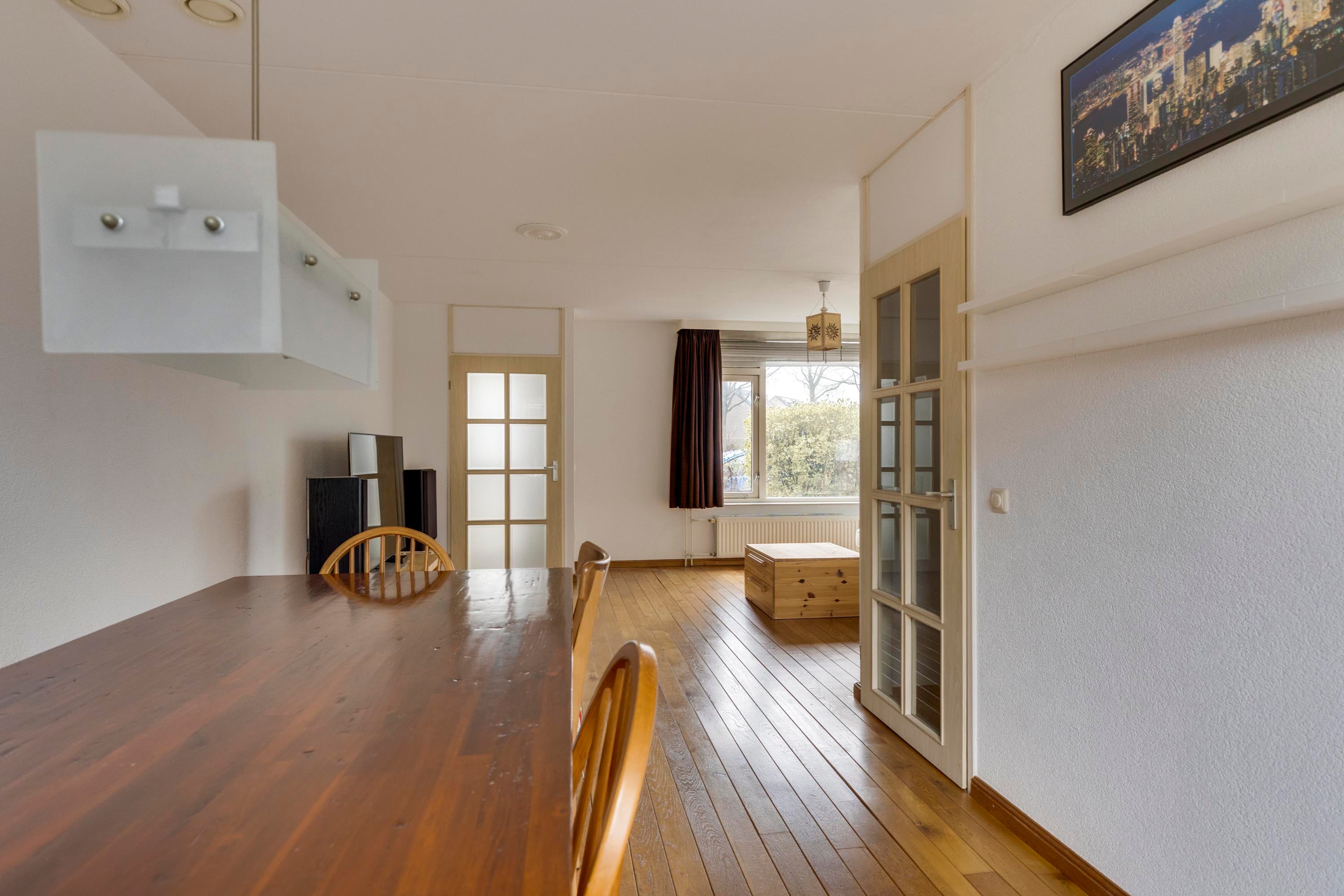 Bij binnenkomst in de hal valt de warme parketvloer met vloerverwarming op. De lichte L-vormige living heeft een gezellig zitgedeelte en een eethoek met uitzicht op de tuin. De dichte keuken is uitgerust met moderne inbouwapparatuur en biedt directe toegang tot de tuin.