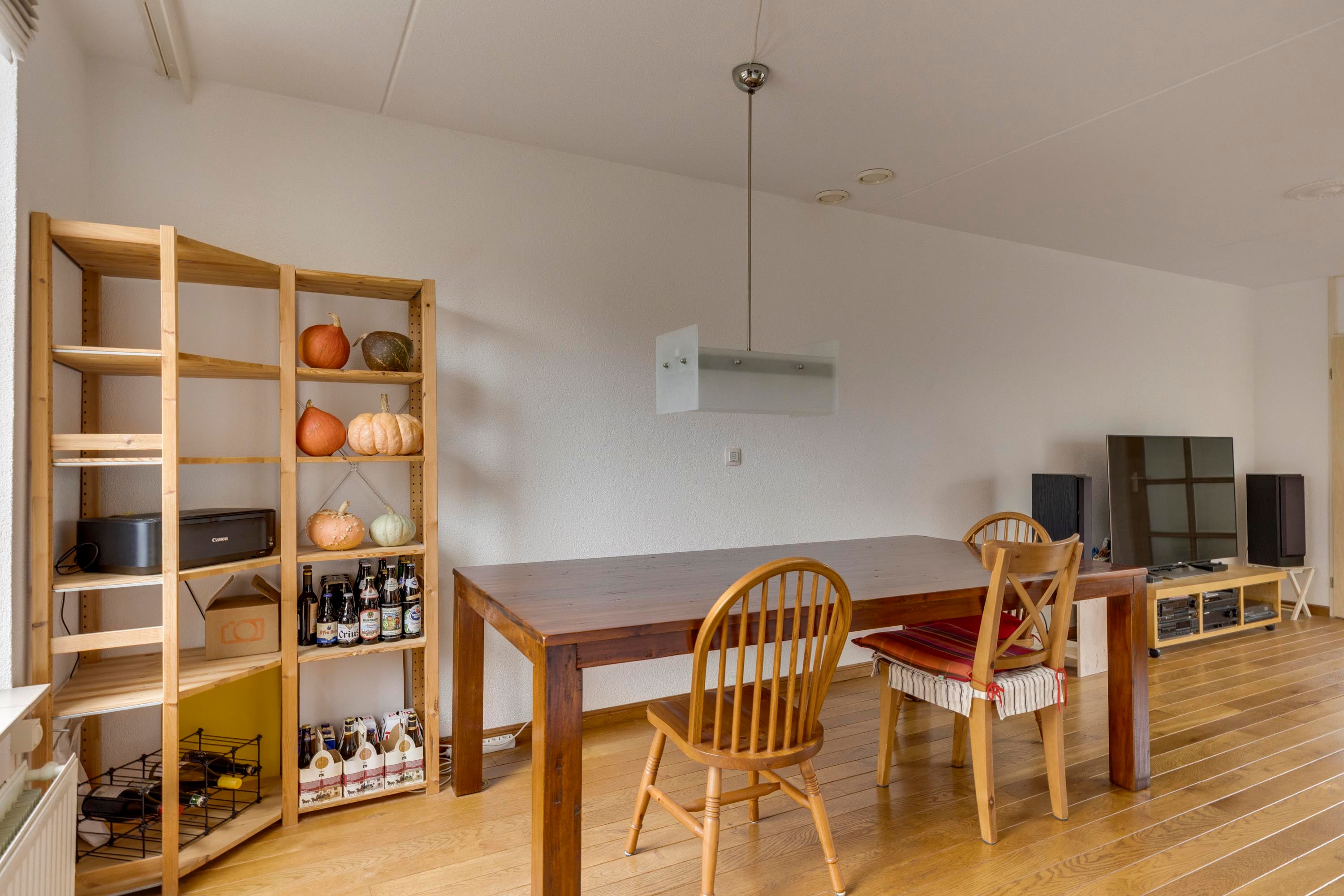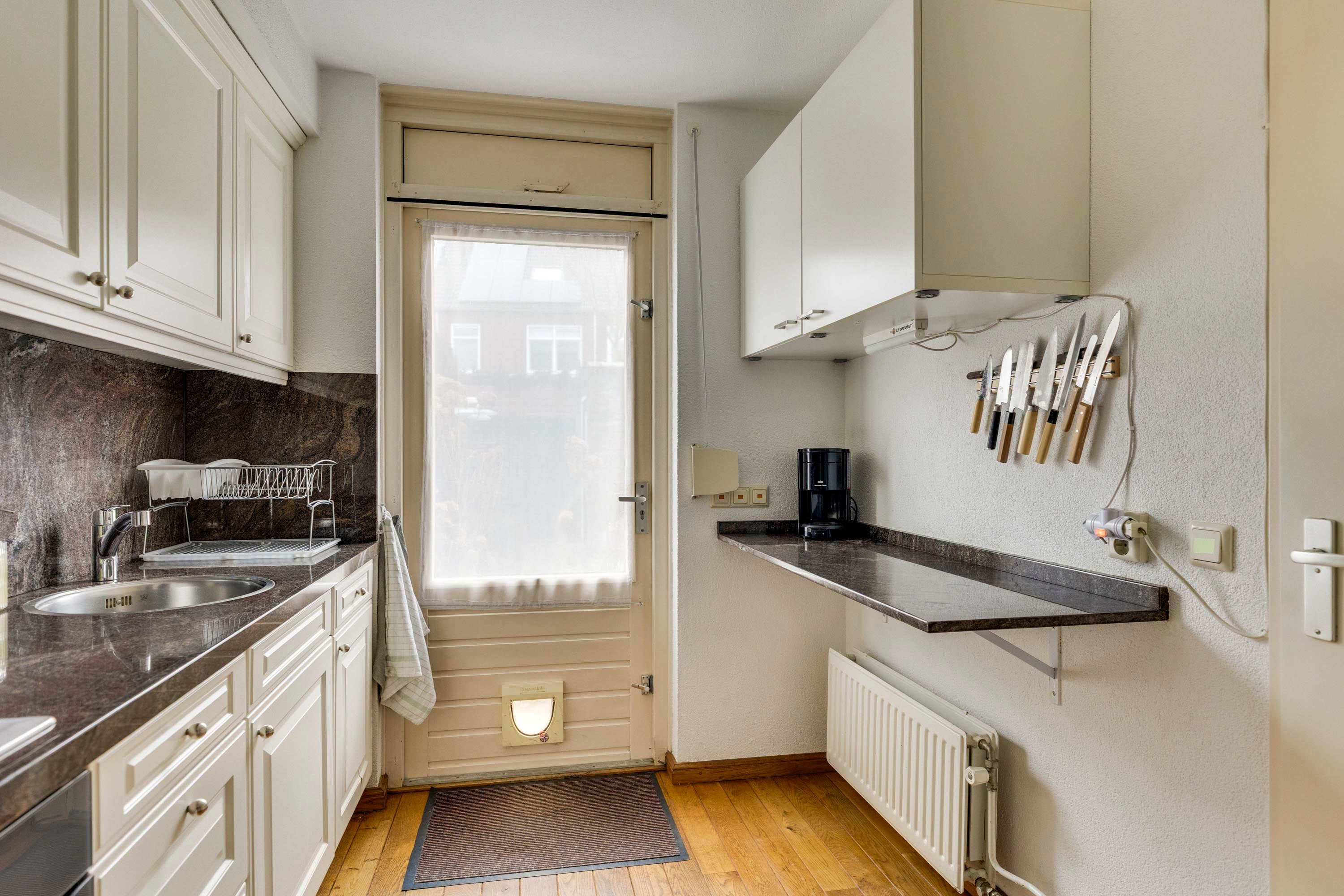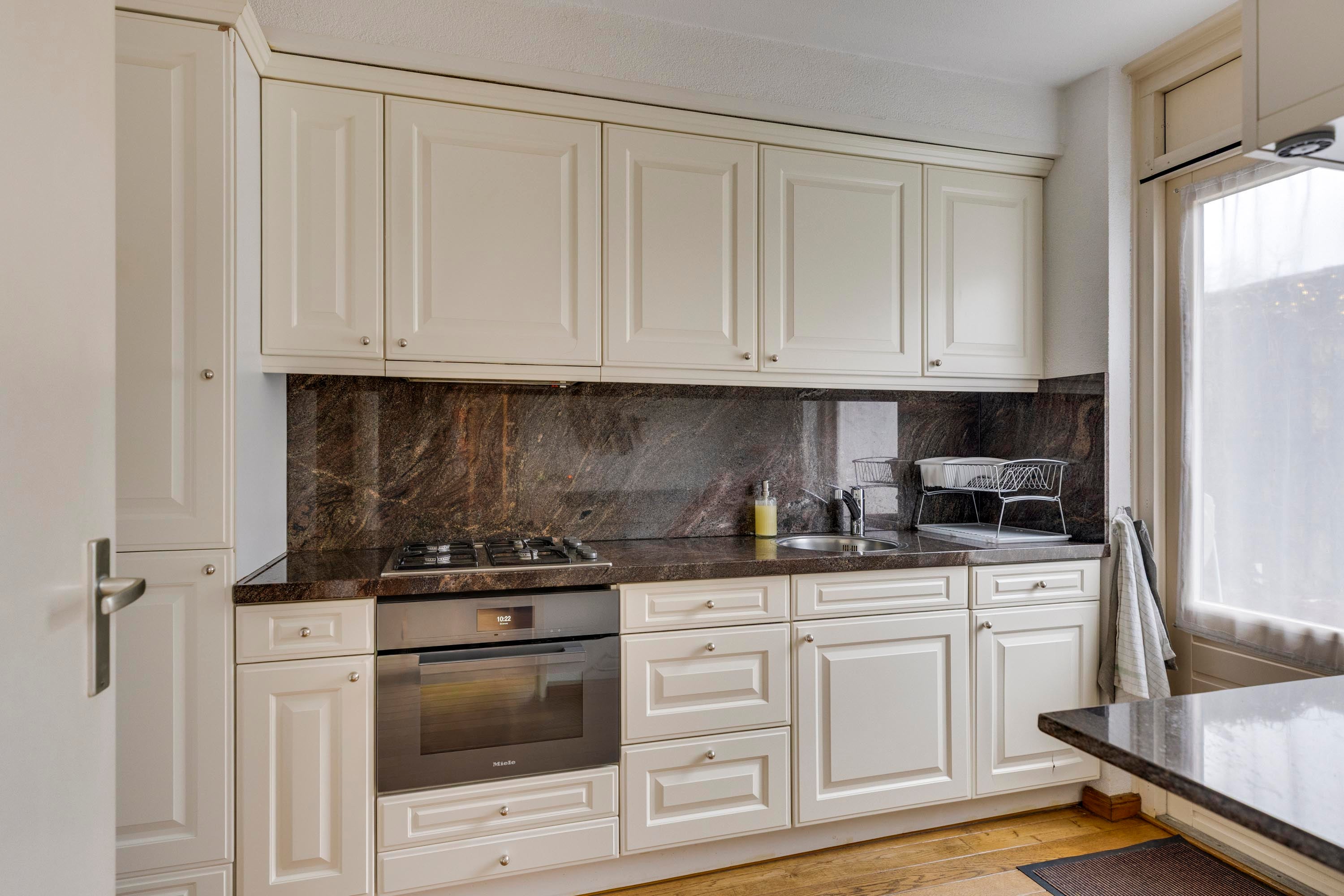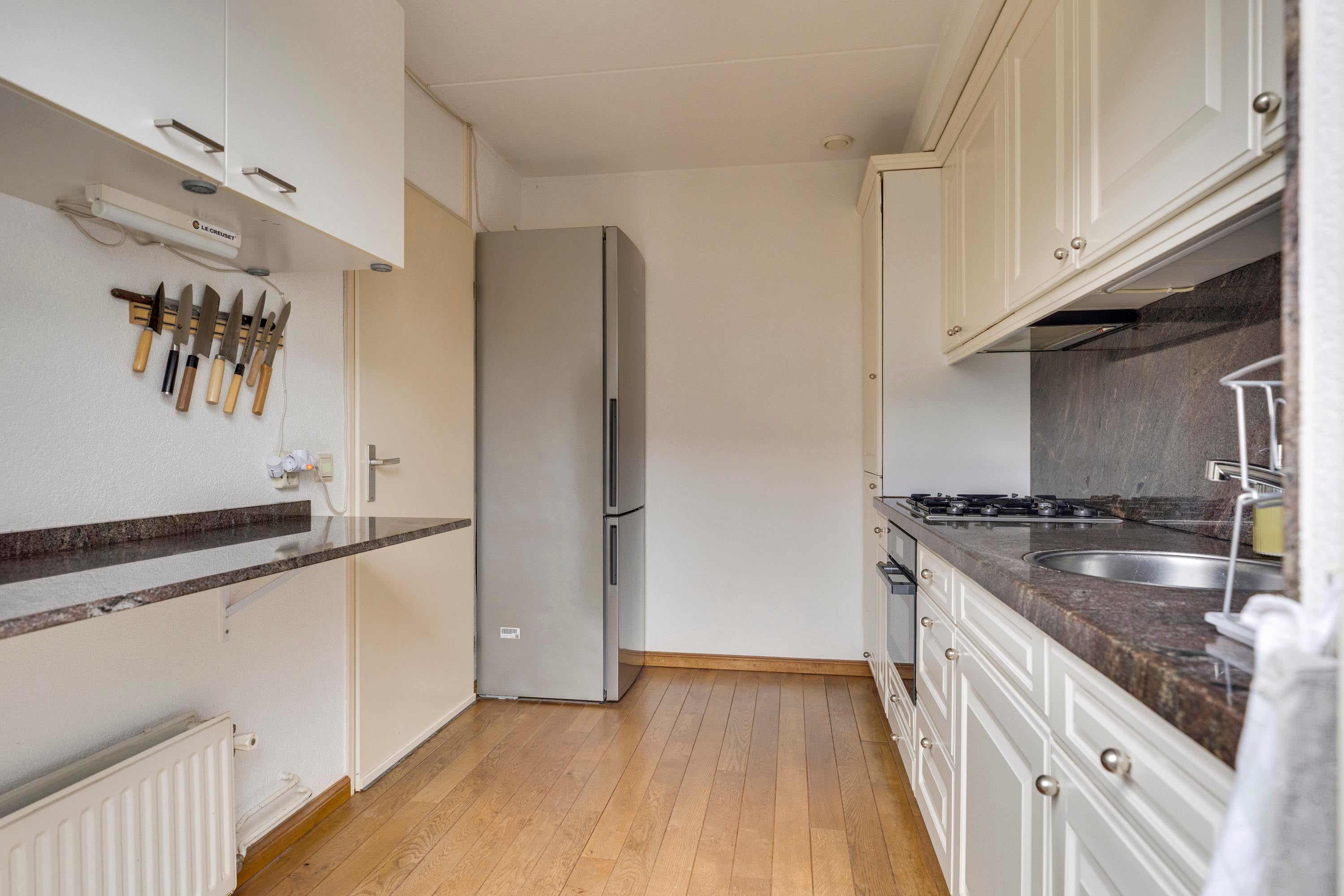 Bij binnenkomst in de hal valt de warme parketvloer met vloerverwarming op. De lichte L-vormige living heeft een gezellig zitgedeelte en een eethoek met uitzicht op de tuin. De dichte keuken is uitgerust met moderne inbouwapparatuur en biedt directe toegang tot de tuin.
