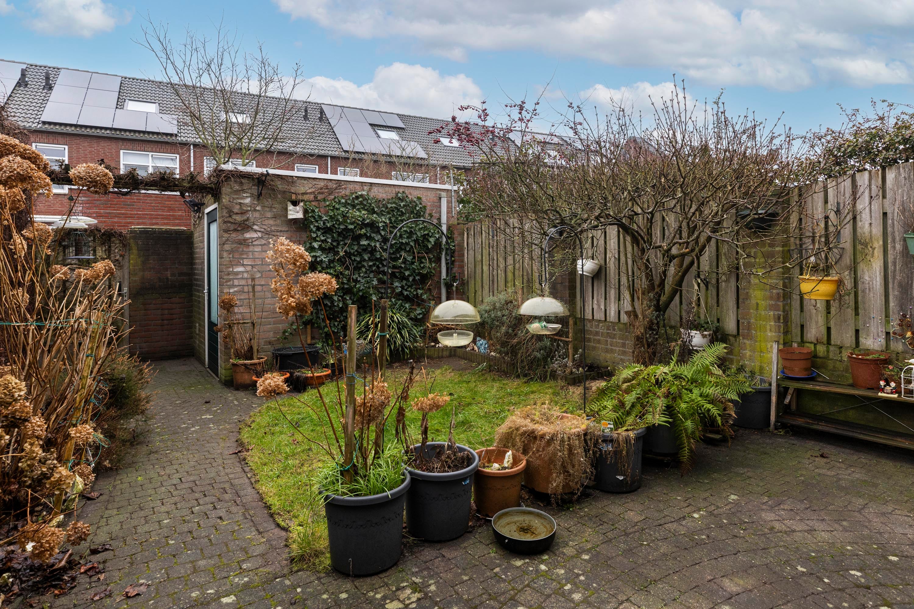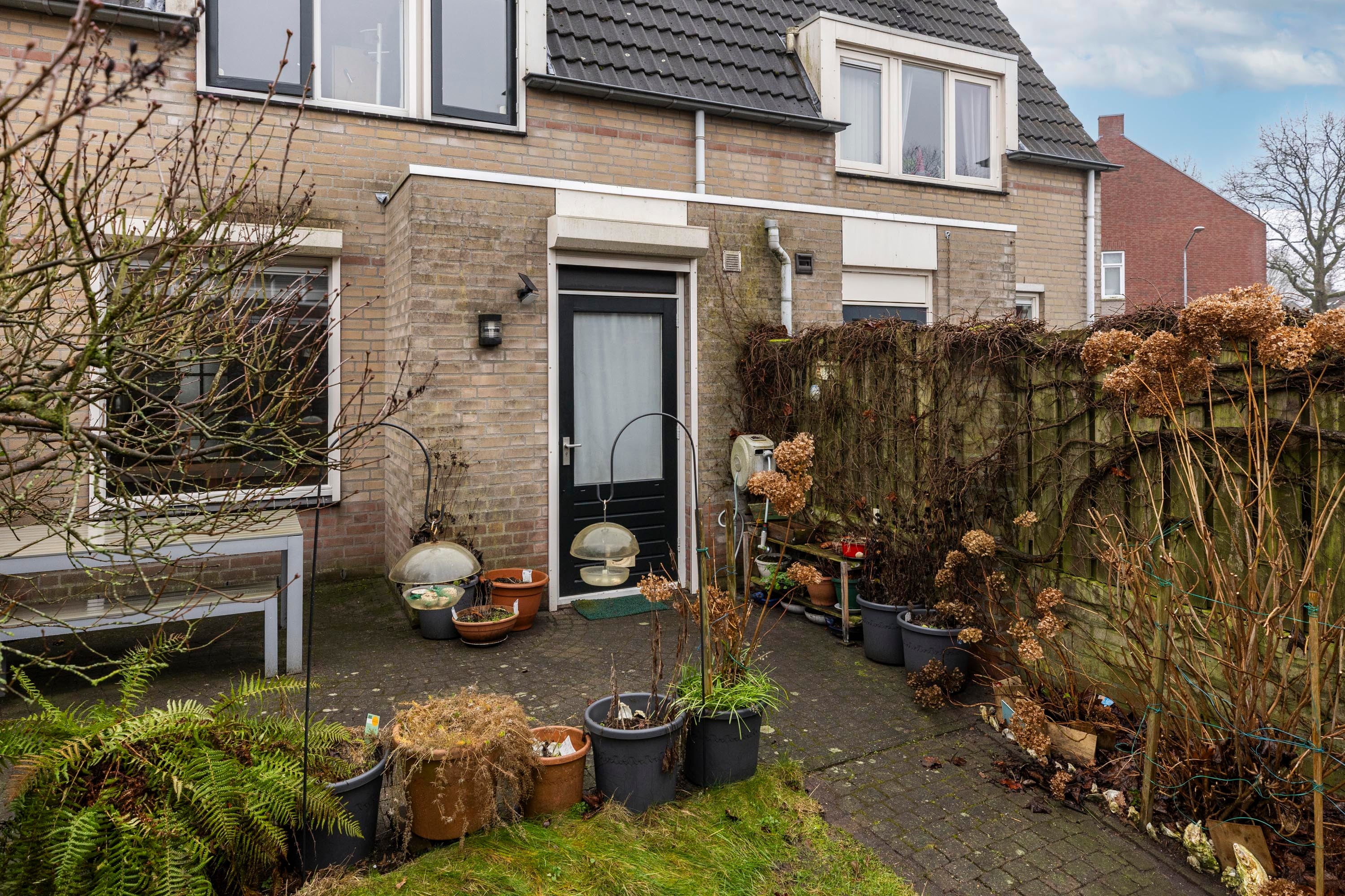 De achtertuin is verzorgd en voorzien van verlichting, met een ruime berging. Dit huis biedt een aangename buitenruimte om in alle rust van te genieten.
