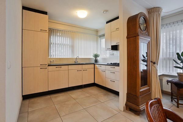 Vanuit de overdekte hal/entree met meterkast is er toegang tot de ruime woonkamer met open keuken en de trapopgang naar de eerste verdieping. De keuken, in L-vorm, is aan de voorzijde van de woning gelegen en is v.v. diverse kasten en lades, een kunststof werkblad met spoelbak en kraan, een 4-pits gaskookplaat, afzuigkap, koelkast (2022) en vaatwasser (2024). In de woonkamer is een trapkast aanwezig wat zorgt voor extra bergruimte. Door de grote raampartijen is er veel lichtinval in de woonkamer. De woonkamer biedt toegang tot de serre/achtertuin. Vanuit de woonkamer is ook een lange gang bereikbaar van waaruit er toegang is tot twee slaapkamers (beide v.v. een kastenwand), het separaat toilet, de badkamer, een berging met wasmachineaansluiting en een bergkast. Vanuit deze gang is ook de aangebouwde garage bereikbaar. Het separaat toilet is deels betegeld en v.v. een hangend toilet met fonteintje. De badkamer is geheel betegeld en v.v. een hangend toilet, ligbad, wastafel en een douche. De vloer van de gehele begane grond is v.v. tegels met grotendeels vloerverwarming (m.u.v. de slaapkamers). De wanden zijn afgewerkt met stucwerk. De plafonds zijn v.v. spuitwerk. De kozijnen zijn van hout met dubbel glas en grotendeels v.v. rolluiken.