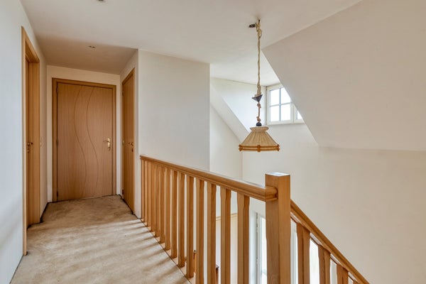 Vanuit de overloop met fraaie vide is er toegang tot 2 slaapkamers, de badkamer en het separaat toilet. De grootste slaapkamer beschikt over een balkon. Vanuit de andere slaapkamer is er toegang tot een kleinere slaapkamer. Hier is een vlizotrap aanwezig welke toegang geeft tot een bergzolder. De zeer royale badkamer is geheel betegeld en v.v. een hoekbad, een douchecabine en een dubbele wastafel met meubel. Het separaat toilet is geheel betegeld en v.v. een hangend toilet en fonteintje