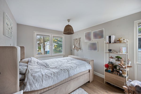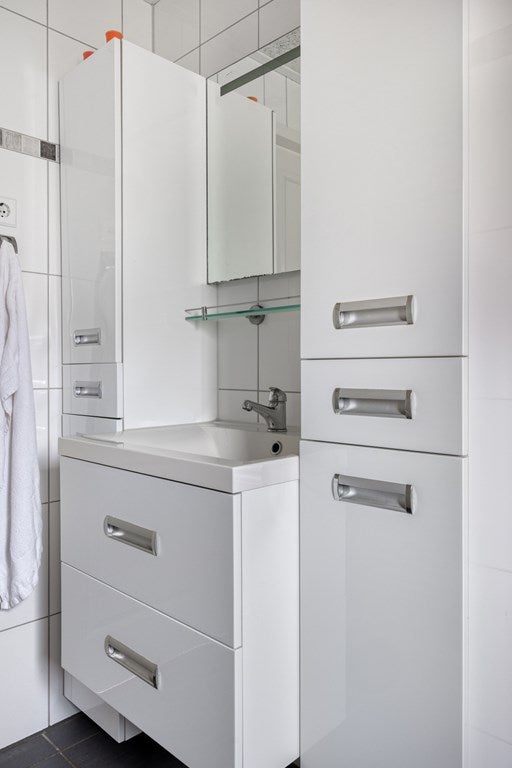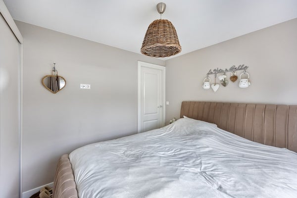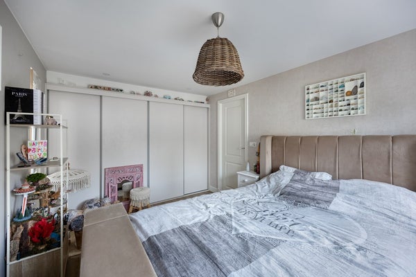 De twee slaapkamers zijn stuk voor stuk ruim en licht. De badkamer is ruim en stijlvol met lichte wandtegels, donkere vloertegels, een douche, een groot wastafelmeubel met veel opbergruimte en witgoedaansluitingen.