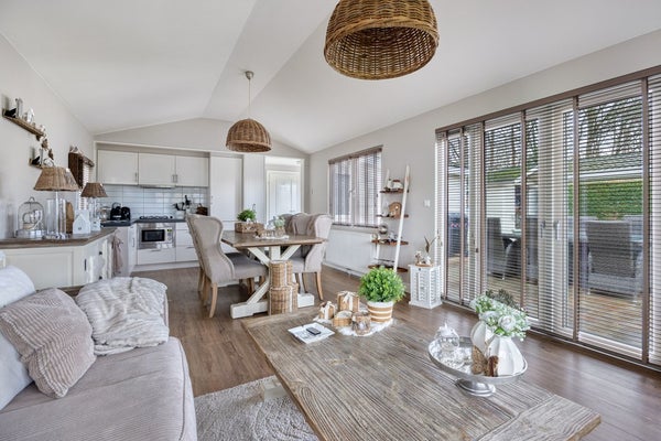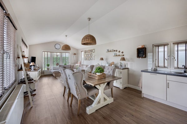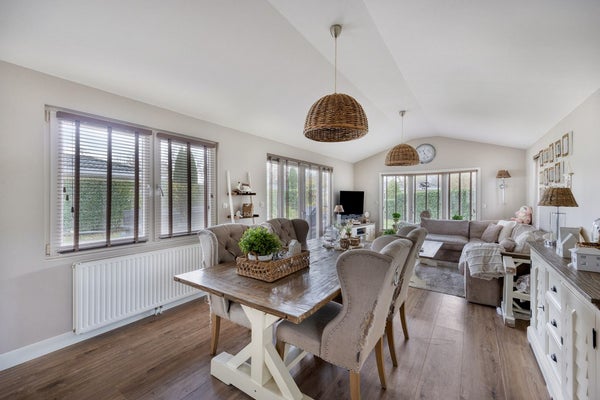 De woonkamer zelf is heerlijk licht en ruim door de grote raampartijen en dubbele openslaande tuindeuren. Hier is meer dan genoeg ruimte voor een sfeervolle zit- en eethoek. Vanuit de woonkamer loop je zo door naar de open keuken en de overige ruimtes.