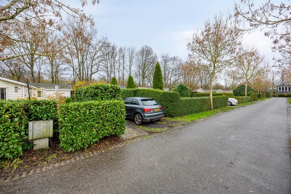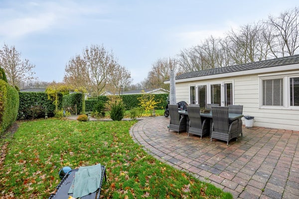 Aan de voorzijde van de recreatiewoning vind je parkeergelegenheid op eigen terrein, omringd door groen. De tuin is royaal en groen aangelegd, met een groot terras direct aan de recreatiewoning verder is de tuin omheind met een haag voor extra privacy, en een ruime berging met aansluiting voor de wasmachine en droger.