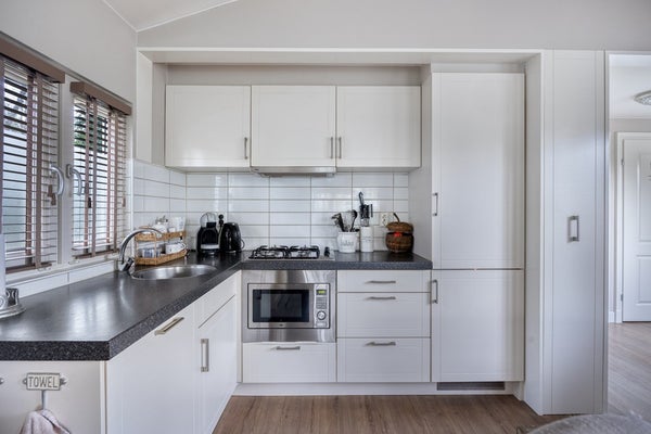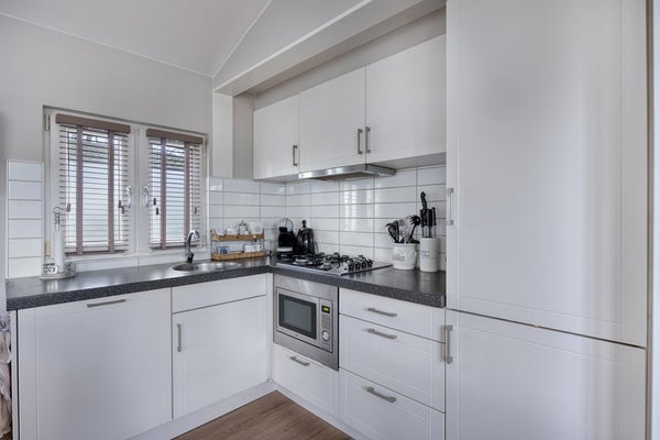 De woonkamer is bijzonder licht en ruim door de grote raampartijen, die zorgen voor een fijne sfeer. Met dubbele openslaande tuindeuren naar de tuin is dit een heerlijke ruimte om tot rust te komen. Er is plaats genoeg voor zowel een zit- als eethoek, en via de woonkamer heb je toegang tot de open keuken. De keuken is ruim opgezet en voorzien van een licht hoekmeubel. Alle nodige apparatuur is aanwezig, zoals een gaskookplaat, afzuigkap, combi-oven, koel-/vriescombinatie en vaatwasser, waardoor koken een feestje wordt.