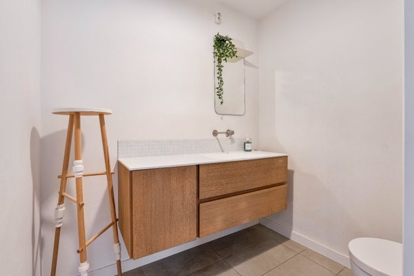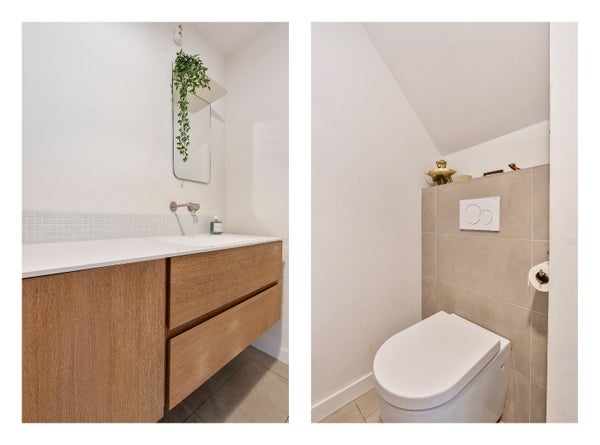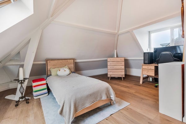Daarnaast vindt u op deze woonlaag een ruime separate toiletruimte, compleet met een groot wastafelmeubel. Ook bevindt zich hier de eerste slaapkamer van ca. 11 m2.