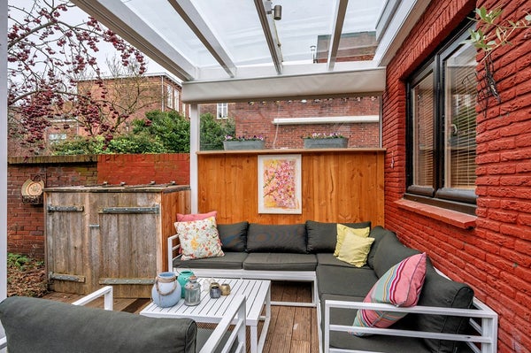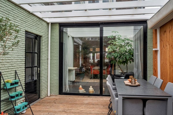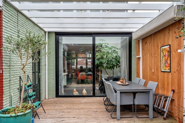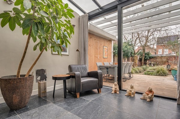 De begane grond is heerlijk licht dankzij de serre. Via de grote glazen schuifdeur loopt de woonkamer naadloos over in de tuin, waardoor binnen en buiten één geheel vormen . De glazen overkapping met zonwering maken het mogelijk om in elk seizoen van het buitenleven te genieten.