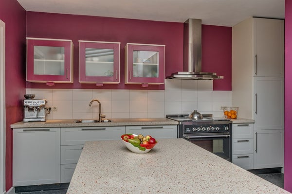 Serre met aansluitend keuken met complete inbouwcombinatie met inbouwapparatuur: koelkast, 5 pits gaskookplaat, afzuigkap, vaatwasmachine en Boretti oven.