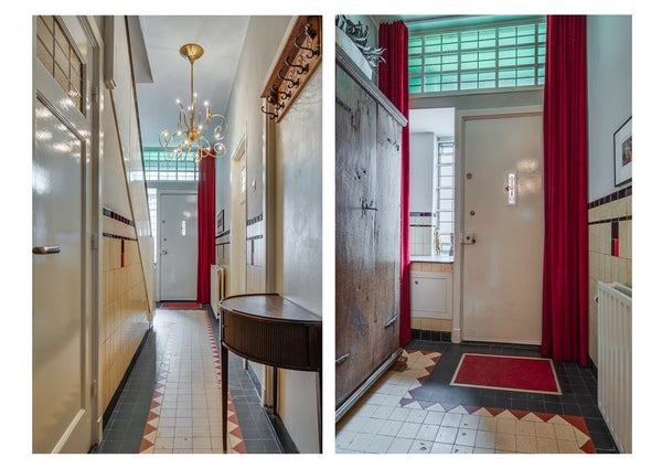 Sfeervolle entree met originele tegelvloer en lambrisering.