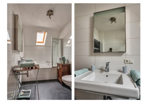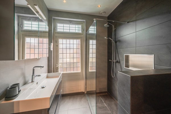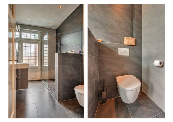 Badkamer met inloopdouche, toilet en dubbele wasatfel; vloerverwarming.