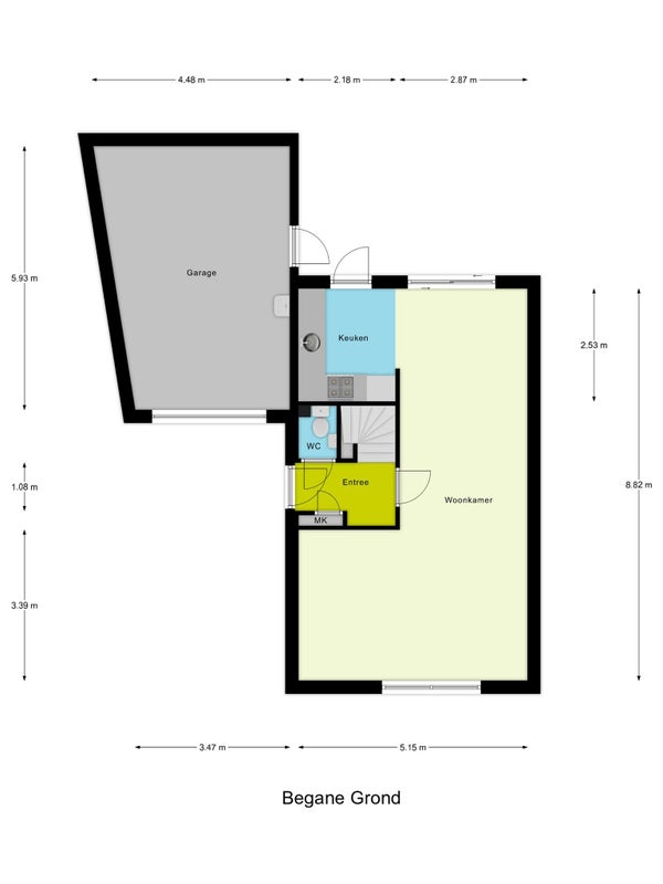 De begane grond beschikt over een entree, een vernieuwd toilet uit 2015, en een L-vormige woonkamer met veel lichtinval, die via een schuifpui toegang geeft tot de tuin. De open keuken is uitgerust met een gaskomfoor, koelkast, afzuigkap, vaatwasser en combimagnetron. De extra grote garage heeft een elektrisch bedienbare poort.