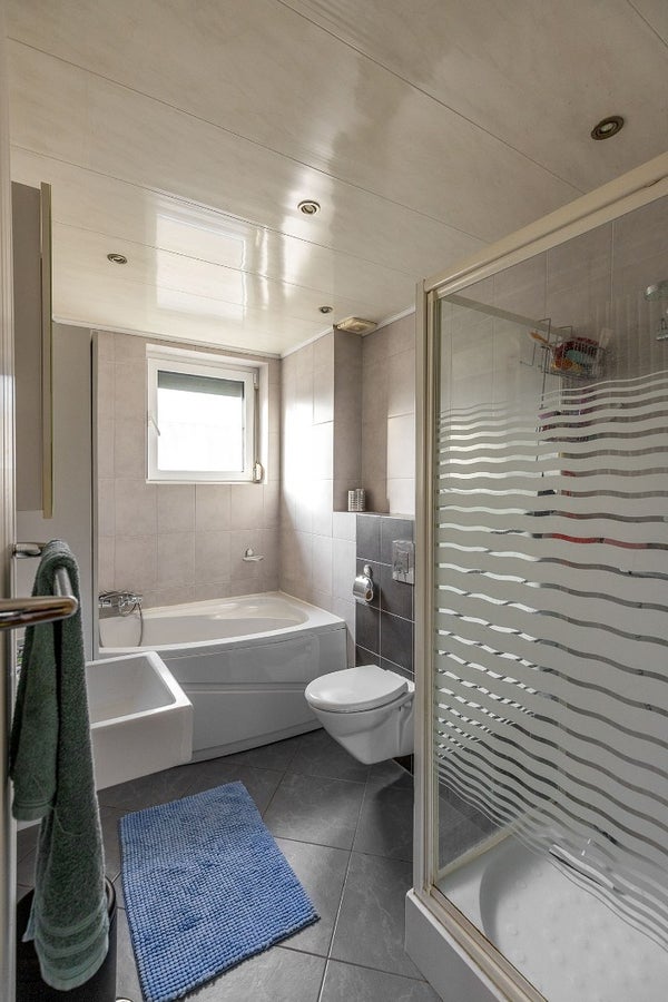 Op de eerste verdieping, waar een laminaatvloer ligt, vind je drie slaapkamers. Ideaal als master bed room, kinderkamer, werkkamer of inloopkast. De badkamer is compleet uitgerust met een ligbad, aparte douche, wastafel en een tweede zwevend closet.