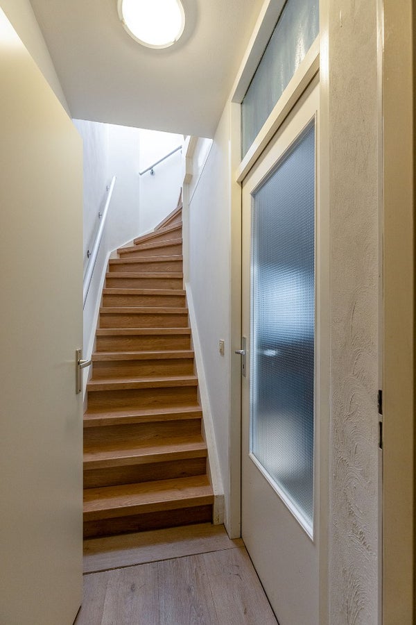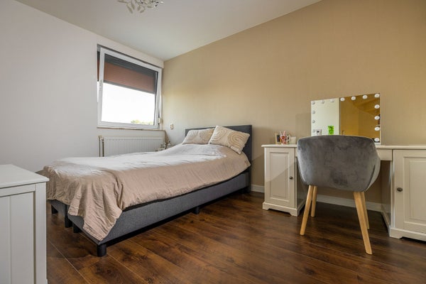 De vaste trap brengt je naar de tweede verdieping, verdeeld in twee ruimten, waar zich de ruime vierde slaapkamer/werkkamer bevindt. Dankzij het dakraam voelt deze ruimte extra licht en ruim aan. In het voorste gedeelte is plaats voor de wasmachine, droger en extra bergruimte. Ook de CV-ketel (2021, eigendom) is hier geïnstalleerd.