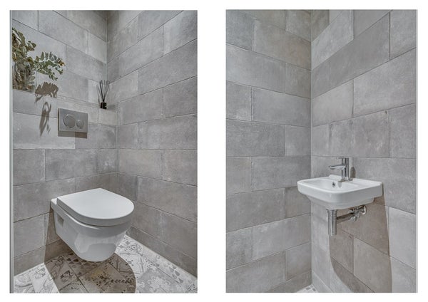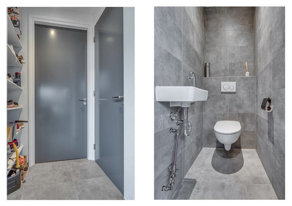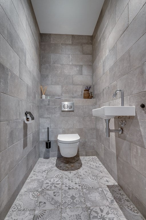 Modern betegeld toilet met fonteintje.