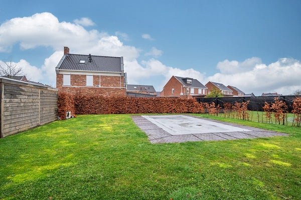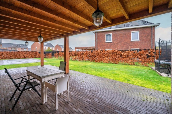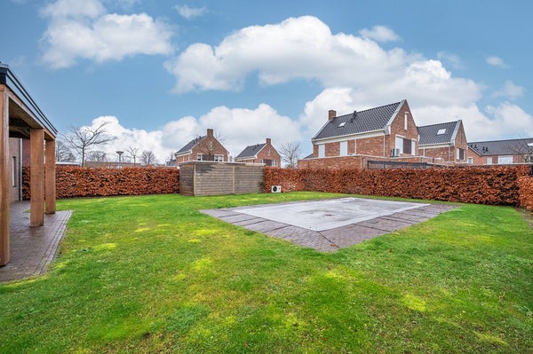 Royale tuin met overdekt terras en gazon. Het verwarmd (warmtepomp) zwembad is 8,00 x 4,00m. De aan de woning grenzende berging is nog voorzien van een separaat toilet met fonteintje. Verder is er nog een houten berging/stalling waar filterinstallatie is geplaatst.