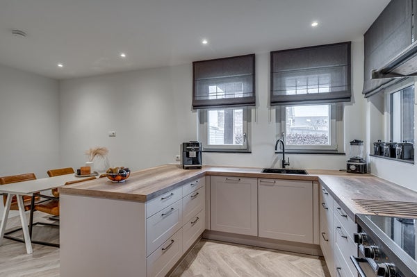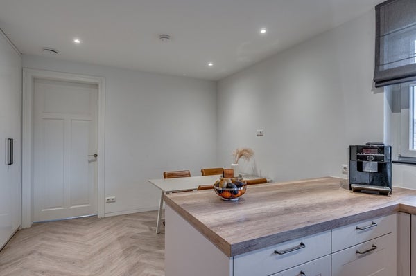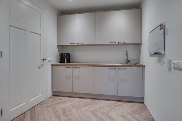 De keuken is uitgevoerd met een strakke, luxe inbouwcombinatie en hoogwaardige apparatuur. Verder beschikt de begane grond over een praktische bijkeuken en een kantoorruimte, ideaal voor thuiswerken.